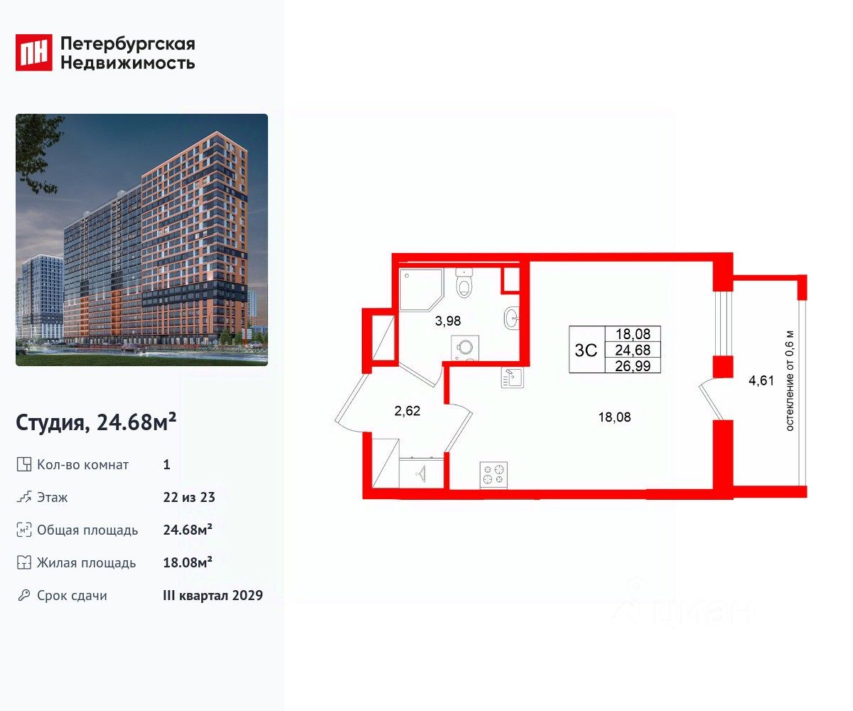 Удобная, классическая, функциональная европланировка, вместительная прихожая 2.62 м². Общая площадь студии - 24.68 м², жилая 18.08 м², высота потолка 2.77 м.
