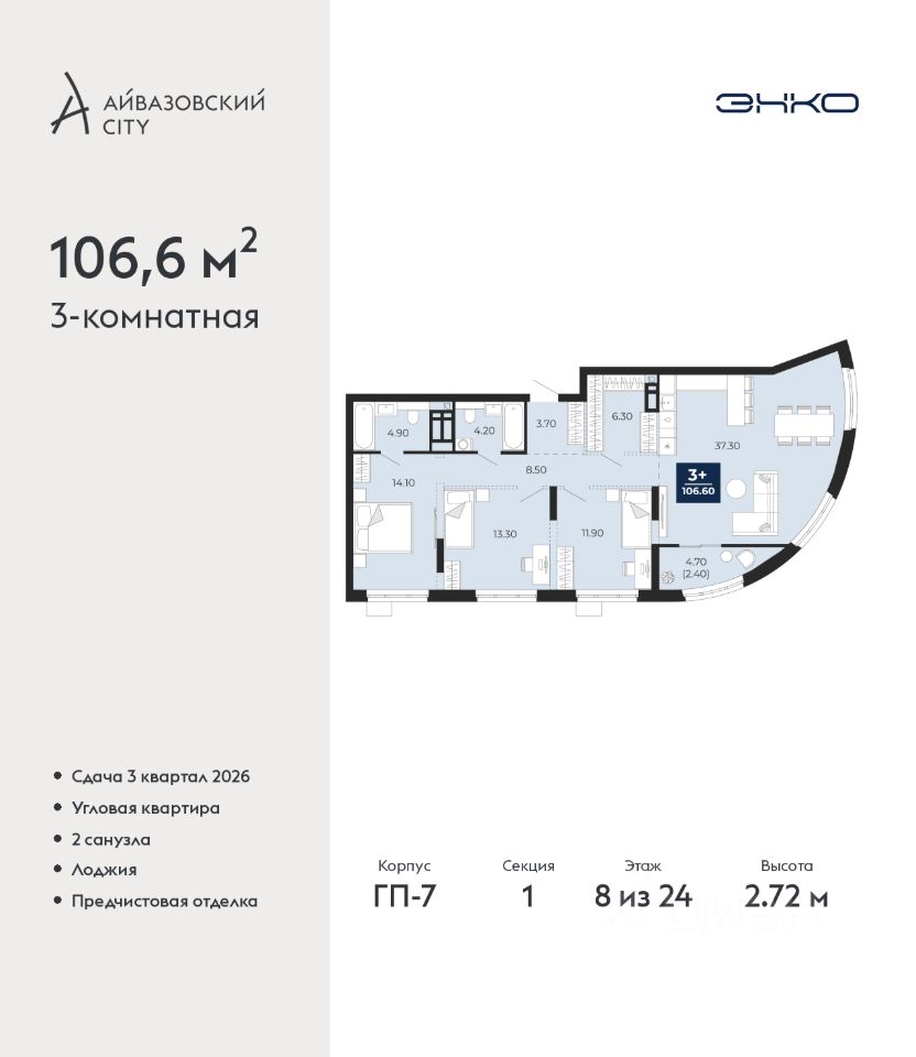Трехкомнатная квартира с предчистовой отделкой в ЖК ''Айвазовский City'' на 8 этаже. Общая площадь: 106.6 кв.м., жилая: 39.3 кв.м., площадь просторной кухни-столовой: 37.3 кв.м. Угловая квартира, идеально подойдет любителям тишины и панорамных видов. В квартире одна лоджия, два совмещенных санузла. Высота потолков 2.72 м.