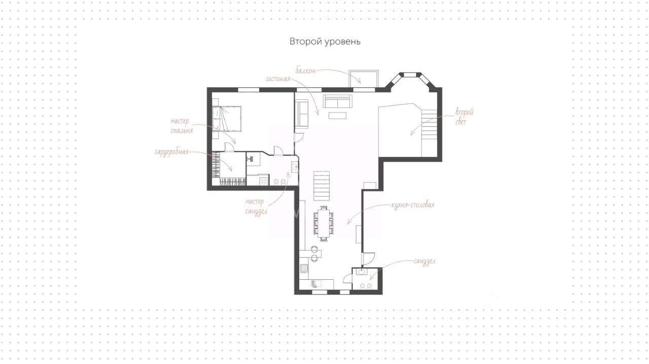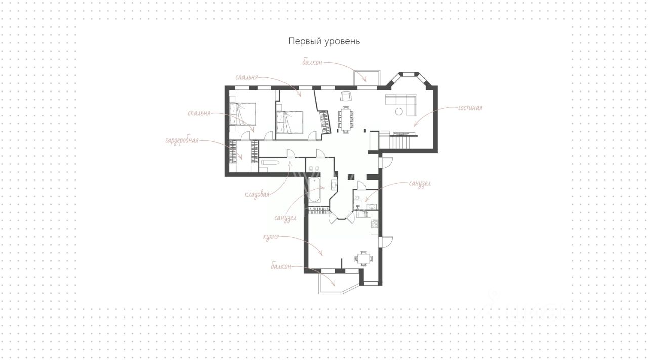Функциональная планировка первого уровня: кухня-столовая, гардеробная, две спальни, два санузла, гардеробная, три балкона, Второго уровня: кухня-гостиная, спальня, два санузла, гардеробная, Третьего уровня: зона отдыха.