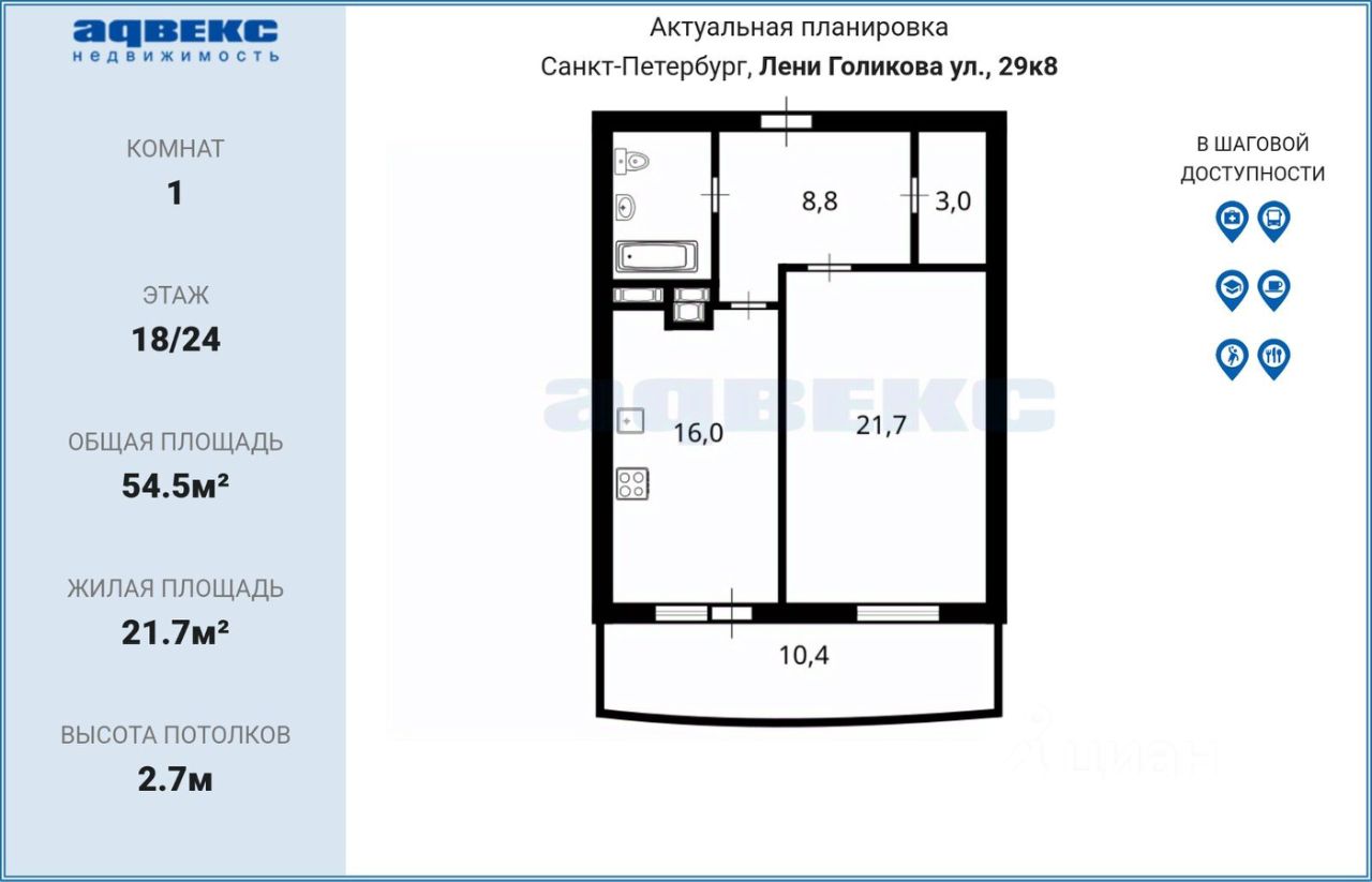 ID: 1915595 - Квартира с отличной планировкой и великолепным видом из окон в удалении от шумных дорог и непосредственно у парка Александрино. Экологически чистый микрорайон города. - До метро ''Пр. Ветеранов'' пешком 20 мин прогулочным шагом. - ЖК ''Чистые пруды''. Кирпично-монолитный дом 2005 года постройки. - Огороженная, охраняемая круглосуточно придомовая территория с ландшафтным дизайном. - Возможна парковка внутри охраняемого двора. И рядом с домом достаточно парковочных мест. - Респектабельная входная группа с консьержем. Четыре современных лифта. - Восточная сторона, в квартире светло и солнечно. Панорамный вид на город с 18 этажа завораживает. - Просторная комната 21,7 кв., из которой вход в гардеробную. - Большая кухня 16 кв.