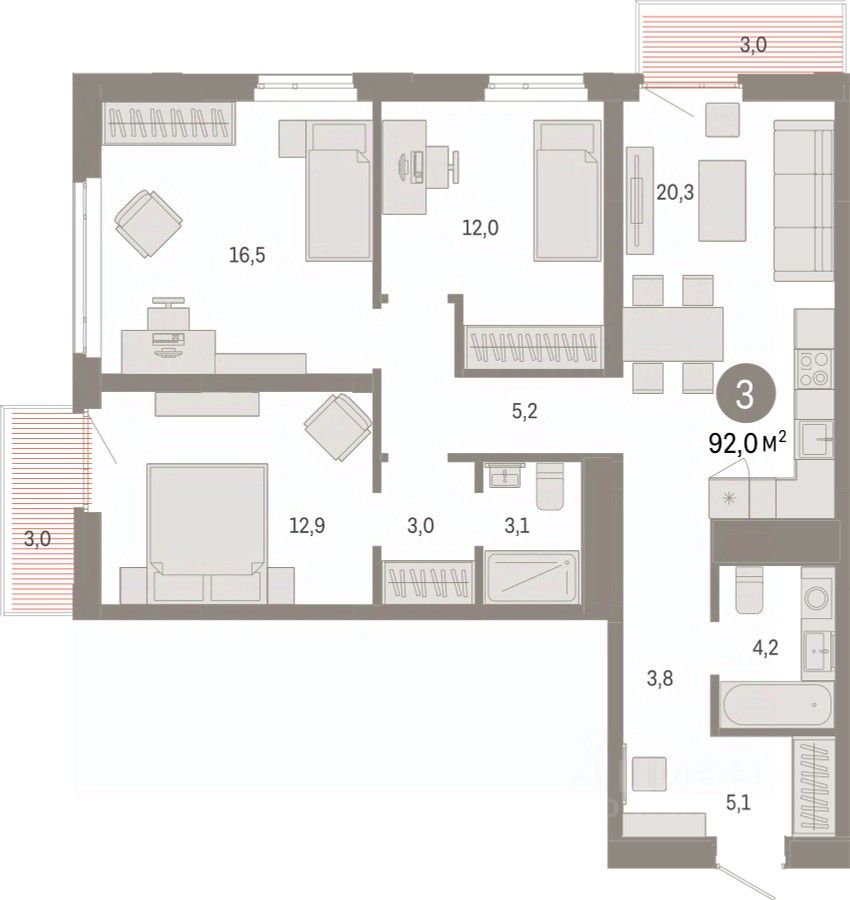 3-комн. квартира от застройщика с предчистовой отделкой в ЖК ''Республики 205'' на 6 этаже. Общая площадь: 91.98 кв.м. Высота потолков 2.7 м.