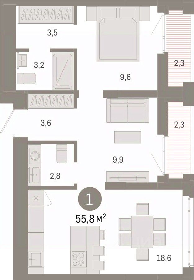 1-комн. квартира от застройщика с предчистовой отделкой в ЖК ''Республики 205'' на 17 этаже. Общая площадь: 55.76 кв.м. Высота потолков 2.7 м.