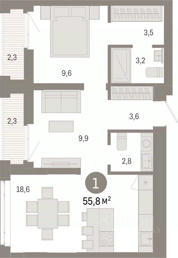 Продается 1-комн. квартира с предчистовой отделкой в ЖК ''Республики 205'' на 17 этаже. Общая площадь: 55.76 кв.м. Высота потолков 2.7 м.