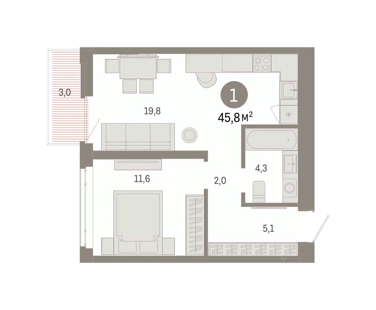 Продается 1-комн. квартира с предчистовой отделкой в ЖК ''Республики 205'' на 7 этаже. Общая площадь: 45.82 кв.м. Высота потолков 2.7 м.