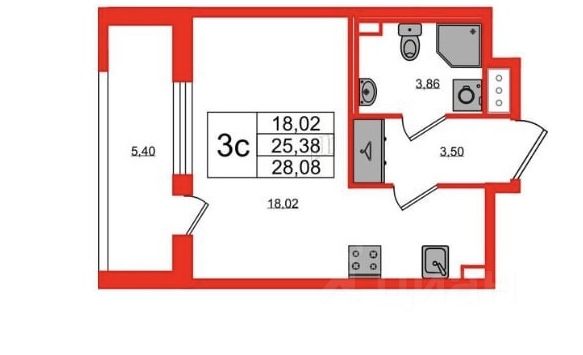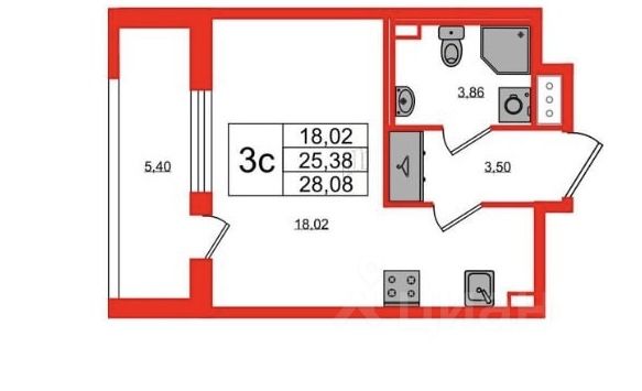 В квартире предусмотрены: - ниша под кухню и шкаф в коридоре, -санузел 3.86 метра (не 3, как обычно в таких студиях) -просторная лоджия 5,4 метра с панорамным остеклением -полная чистовая отделка от застройщика