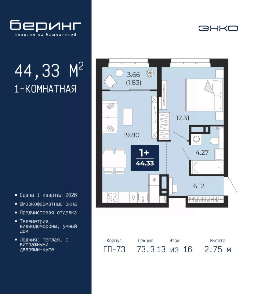 Просторная однокомнатная квартира с предчистовой отделкой в ЖК ''Беринг'' на 13 этаже. Общая площадь: 44.33 кв.м., жилая: 12.31 кв.м., площадь просторной кухни-столовой: 19.8 кв.м. Все окна выходят на одну сторону. В квартире одна лоджия, один совмещенный санузел. Высота потолков 2.75 м.