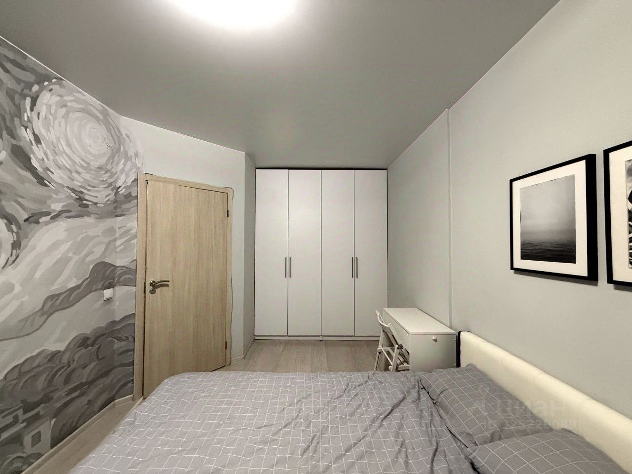 Уютная спальня 16 кв.м. На стене Звёздная ночь Ван Гога На балконе большой шкаф, барная стойка и 2 стула