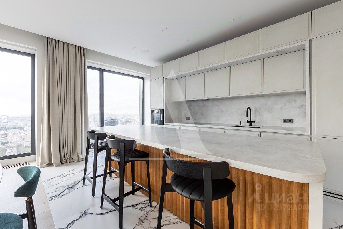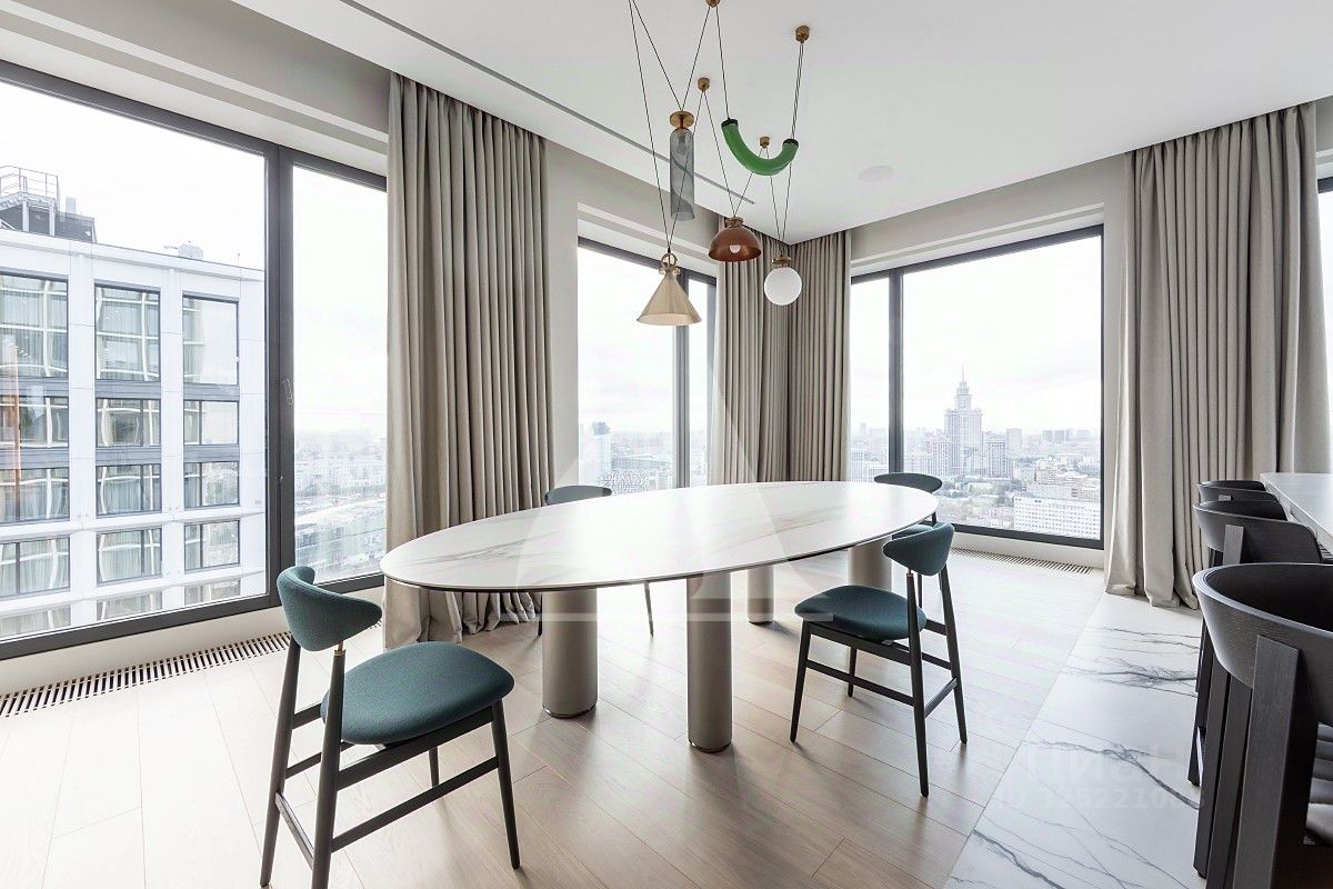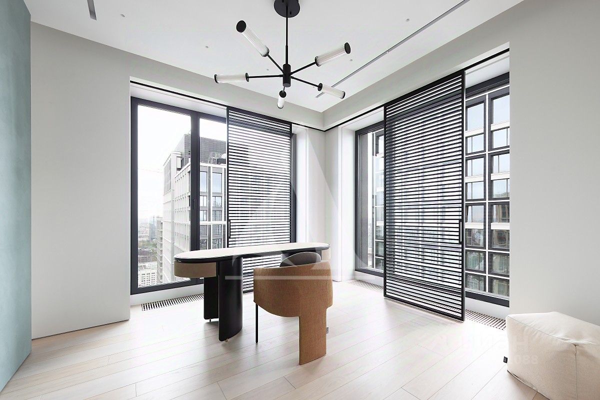 Интерьер выполнен в светлых тонах с использованием эксклюзивных материалов (дерево, мрамор). Большие панорамные окна, выходящие на 3 стороны, и высокий этаж позволяют любоваться панорамой города.
