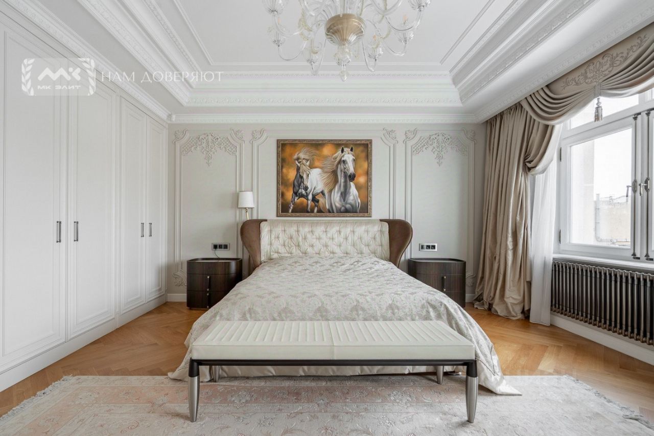 Попадая в квартиру, вы сразу оказываетесь в роскошном парадном холле с большой гардеробной и потрясающим наборным полом из редких сортов камней. Минуя холл, вы очутитесь в просторной гостиной, буквально наполненной воздухом и светом, благодаря большим деревянным окнам с изящными кремонами. Пространство функционально и разделено на три зоны: кухню, оборудованную лучшей техникой от известных мировых брендов, столовую и гостиную с камином, стереосистемой и большим экраном, в которой можно устраивать киновечера. В квартире есть две спальни с личными санузлами, гостевая комната, кабинет, дополнительный санузел для гостей и техническая комната для хозяйственных нужд. Каждая спальня и ванная комната — отдельный вид искусства. Они выполнены в своей индивидуальной стилистике, которая прекрасно сочетается с общей стилевой концепцией ремонта. Сердце квартиры — мастер-спальня площадью 34 м2 с фортепиано, изящным дамским туалетным столиком, большой гардеробной и ванной.