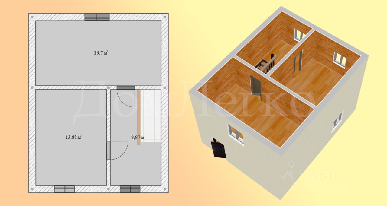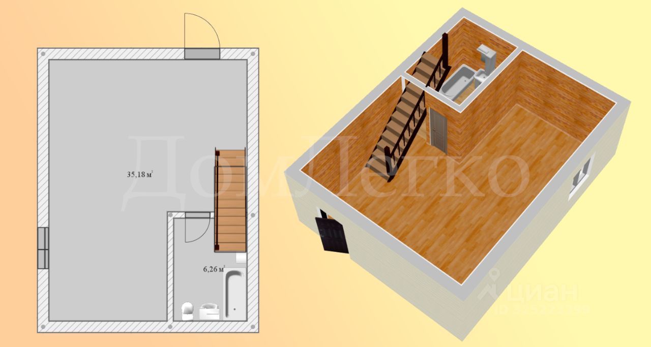 На 1 этаже большое пространство кухни, объединенное с гостиной, санузел с ванной комнатой, на 2 этаже две комнаты.