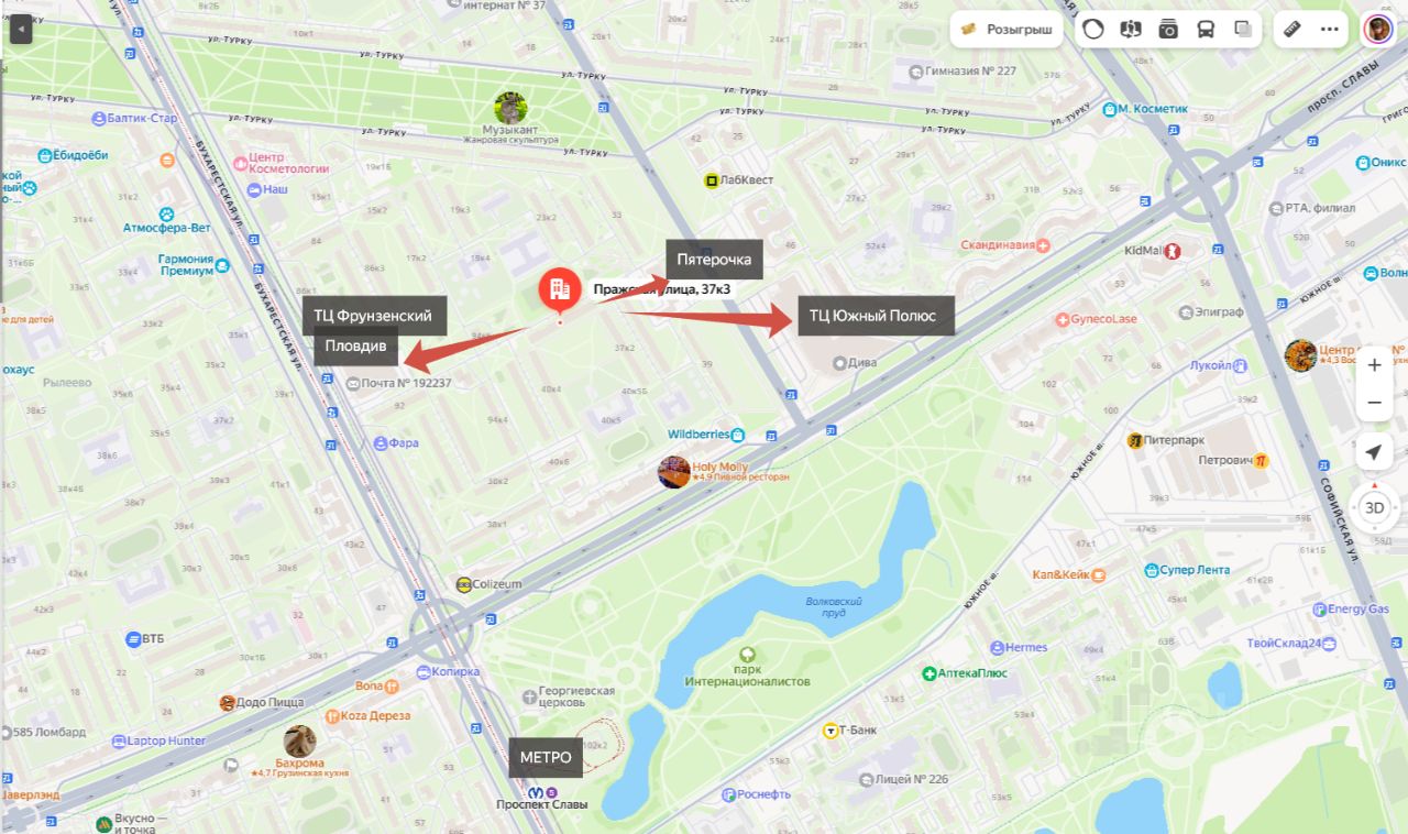 Расположение: Отличная транспортная доступность: — 7 минут пешком до метро пр. Славы — 15 минут до метро Международная — 10 минут на автомобиле до КАД — около 20 минут до центра города Общественный транспорт ходит с трёх сторон дома. В шаговой доступности ТЦ Южный Полюс, ТЦ Фрунзенский (Пловдив), Пятёрочка, кафе, рестораны и магазины, очень развитая инфраструктура. Рядом парк Интернационалистов, парк Героев-Пожарных, парк Дружбы, скверы — удобное и зелёное место для жизни и прогулок.