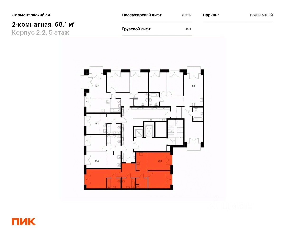 Продаётся 2-комн. квартира площадью 68,1 кв.м на 5 этаже 9 этажного дома (Корпус 2.2, Секция 10) проекта ПИК Лермонтовский 54. Светлый просторный подъезд на уровне земли, функциональная планировка, большие окна, без отделки.