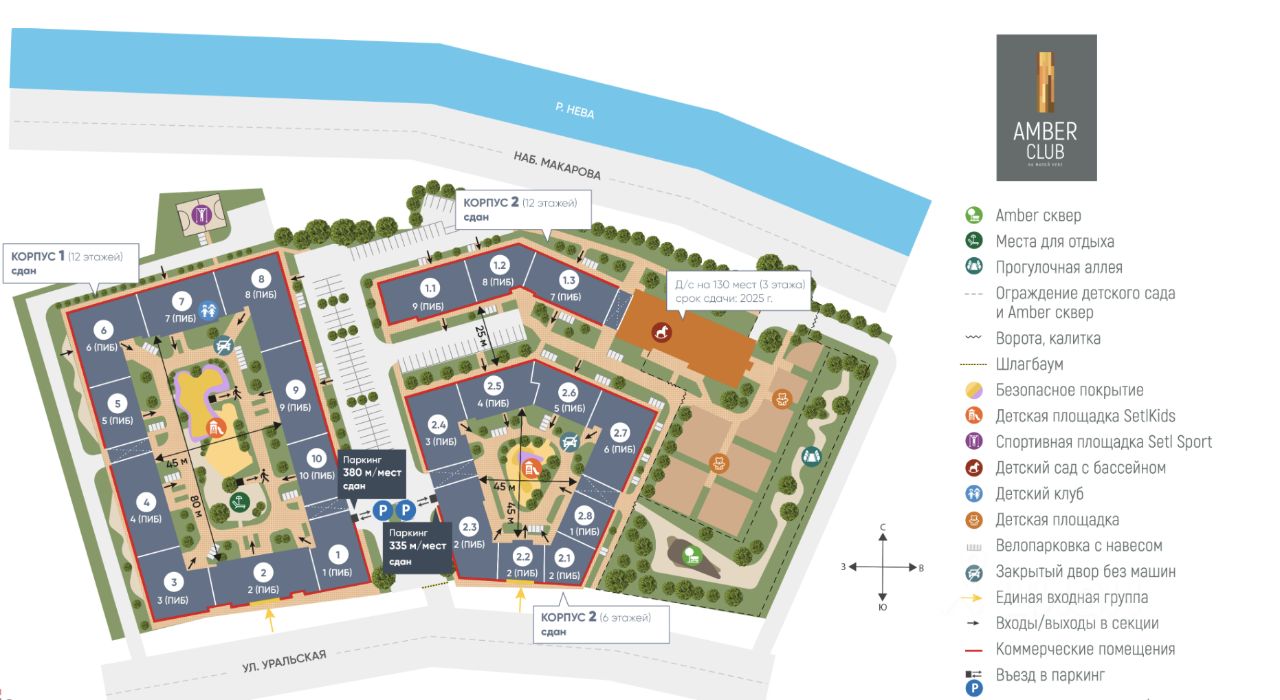 Преимущества ЖК Amber Club: * Великолепное расположение: прямой доступ к основным транспортным развязкам, метро и автомобильным мостам. В центре Санкт-Петербурга, рядом с деловыми и культурными районами. Рядом с домом развитая инфраструктура: магазины, кафе, рестораны, спортзалы, клиники и др. * Зеленая территория и отдых: рядом с ЖК благоустроенная набережная, прогулочные зоны и зеленые скверы для активного отдыха и прогулок. * Безопасность и приватность: закрытая территория с шлагбаумом, охрана и зеленый двор без машин создают камерную атмосферу. Внутри двора есть детские и спортивные площадки, предусмотренные только для жителей комплекса. * Паркинг: Возможность снять/приобрести место в подземном паркинге.