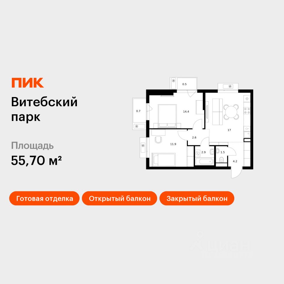 Продаётся 2-комн. квартира площадью 55,7 кв.м на 8 этаже 12 этажного дома (Корпус 6, Секция 3) проекта ПИК Витебский парк. Светлый просторный подъезд на уровне земли, функциональная планировка, большие окна, c отделкой.