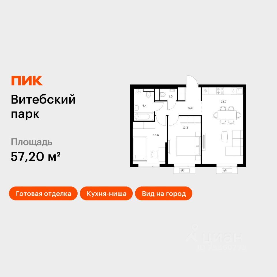 Продаётся 2-комн. квартира площадью 57,2 кв.м на 7 этаже 12 этажного дома (Корпус 6, Секция 3) проекта ПИК Витебский парк. Светлый просторный подъезд на уровне земли, функциональная планировка, большие окна, c отделкой.