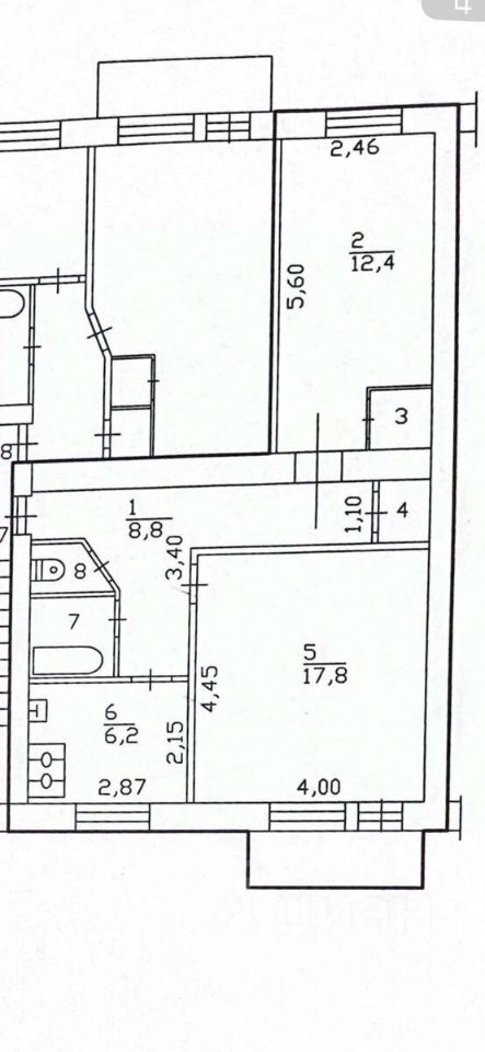 Квартира общ. площ. 52.2 (с балконом), расположена в кирпичном доме, состоит из двух изолированных комнат 17.8+13.8, разделённых длинным коридором, есть кладовка, сан. узел раздельный, установлена ванна, есть гор. вода.