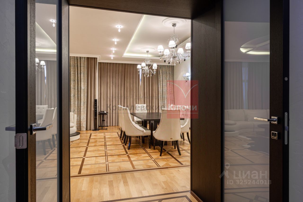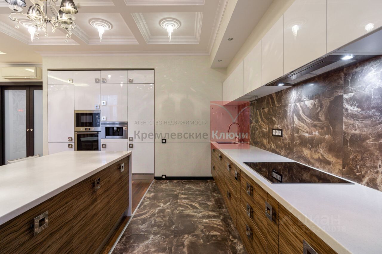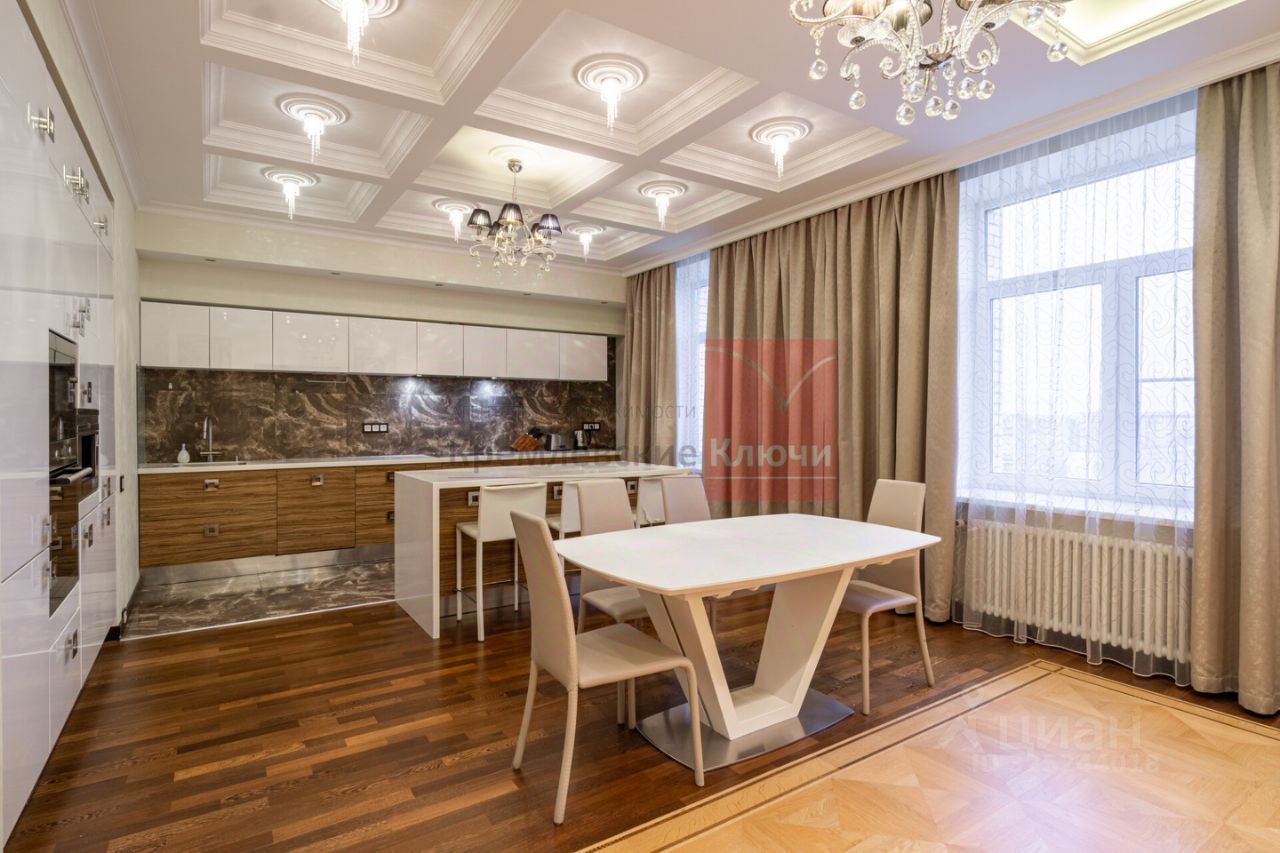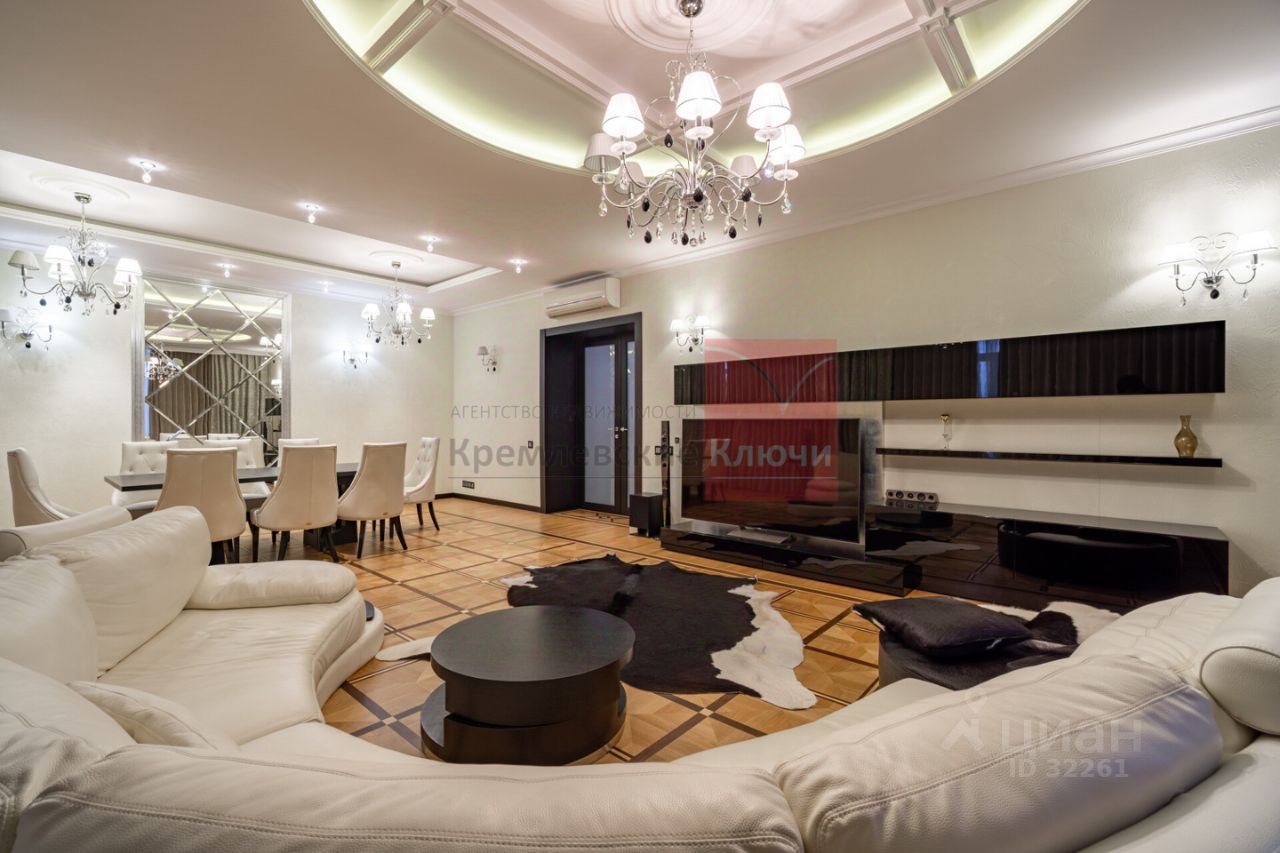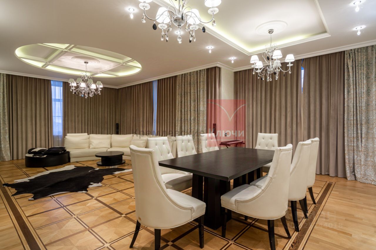 Общая площадь квартиры составляет 297,3 кв. м, жилая площадь — 179,2 кв. м, кухня- столовая 31,7 кв. м., большая гостиная 52,6 кв.м.