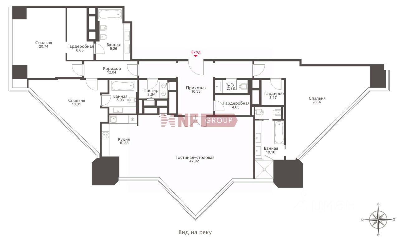 Лот: 101244. Эксклюзив NF GROUP. В продаже апартаменты с отделкой в небоскрёбе Mercury City Tower — одном из самых узнаваемых символов ''Москва-Сити''. Башня объединяет статус, комфорт и сервис уровня международных пятизвёздочных отелей. Планировка: просторная кухня-гостиная с обеденной зоной и панорамными окнами, две мастер-спальни с ванными комнатами и гардеробными, кабинет (при желании — спальня) с собственным санузлом, холл с гардеробной, гостевой санузел, постирочная, подсобное помещение. Всего — три жилые комнаты и четыре санузла. Апартамент меблирован, кухня оснащена встроенной техникой. Интерьер выдержан в английском классическом стиле: отделка выполнена из натуральных материалов, мебель подобрана с акцентом на элегантность и комфорт. Ремонт обновлён год назад. Высота потолков — 3 м. Из окон открываются виды на МГУ, Храм Христа Спасителя, Лужники, Москву-реку и центр столицы. Доступен клубный этаж с фитнесом и SPA, сигарной, 5-уровневый паркинг, ''умный дом'', консьерж-сервис. Отдельный въезд, скоростные лифты, фильтрация воды.