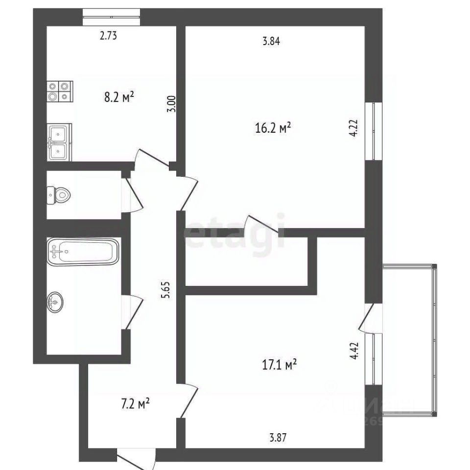 Планировка: • Две изолированные комнаты: уютная спальня с гардеробной 17,1 кв. м. и гостиная (детская)16,2 кв. м. • Раздельный санузел, ванная комната 3,6 кв. м. • Зона хранения в прихожей