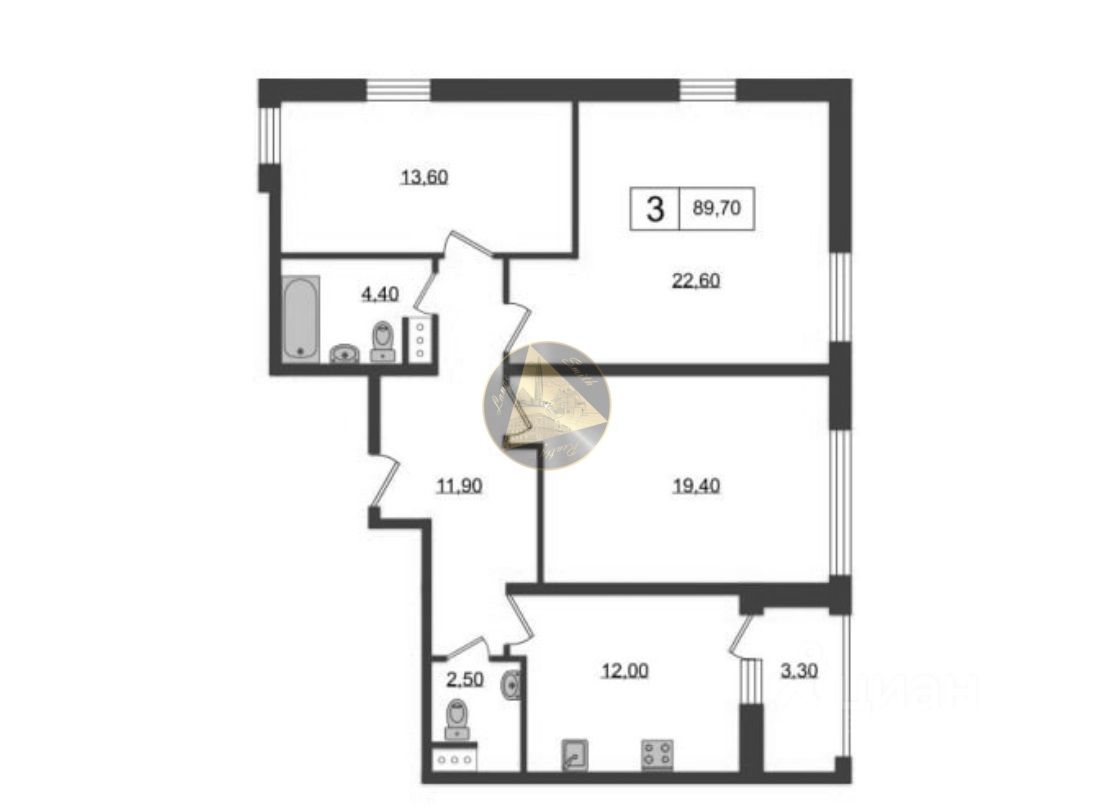 2) Под каждым корпусом паркинг на 104 машино-мест и сити-боксы для хранения сезонных вещей, на первом этаже — коммерческая площадь. 3) Из социальных объектов в рамках проекта есть детский клуб переданный в собственность жильцов. Ваш досуг в 5 минутах от вас. 4) На территории две площади с фонтанами, цветниками и скамейками. В глубине двора детские и спортивные зоны, площадка для игры петанк. 5) Поблизости работают торговые центры ''Варшавский экспресс'', ''Планета Нептун'' и ''Лиговъ''. Социальные объекты в большинстве находятся за Обводным каналом. Например, ближайшие гимназии — в 20 минутах ходьбы, одна из них с углубленным изучением иностранных языков. -- - Квартира находится на 6 этаже 16-и этажного дома. - Общая площадь квартиры 89,7 м2. - Кухня 12 м2. - Гостиная 19,4 м2. - Спальня 22,6 м2 - Детская 13,6 м2. - Общая 40,11 м2 - Лоджия 3.3 м2. - Санузел: 2.5 + 4.4 м2