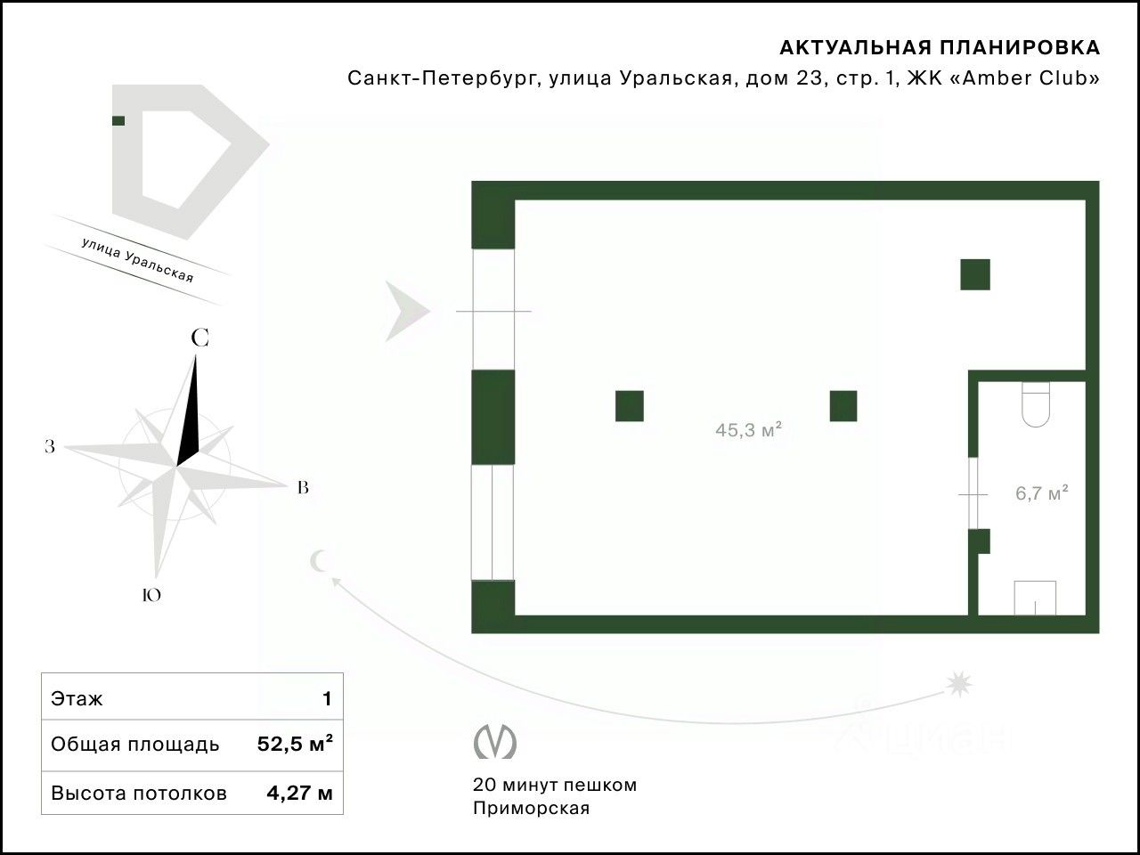 Арт. 127986575 Коммерческое помещение с высокими потолками и витринным остеклением в комплексе ''Amber Club''. Отдельный вход с фасада, свободная планировка и высокий пешеходный трафик — место с большим потенциалом для розничной торговли, услуг, шоу-рума, студии или небольшого офиса. Помещение правильной формы с высотой потолков 4,27 м — такой объём добавляет пространству воздуха и открывает возможности для нестандартных решений в оформлении. Большие витринные окна обеспечивают естественное освещение и хорошую видимость с улицы. Вход организован на уровне земли, что создаёт максимальный комфорт для клиентов и высокую просматриваемость. На фасаде можно разместить вывеску. Подключена электрическая мощность 13 кВт, установлен узел учёта электроэнергии. Разводку сети и установку фурнитуры арендатор выполняет самостоятельно. Вентиляция организована отдельно от жилой части через индивидуальные вытяжные каналы. Парковка расположена непосредственно у помещения. Отличная транспортная доступность: до станции метро ''Приморская'' всего 15 минут пешком. Комплекс сдан и заселён на 95% — более 1400 квартир с готовой отделкой гарантируют стабильный поток клиентов. В шаговой доступности детский сад, государственная поликлиника, соседние комплексы ''Эмеральд на Малой Неве'' и апарт-отель ''Docklands'' — всё это формирует высокий потенциал локации и привлекает платёжеспособную аудиторию. Предусмотрено предоставление арендных каникул — условия обсуждаются индивидуально. Звоните, чтобы узнать детали и договориться о просмотре.