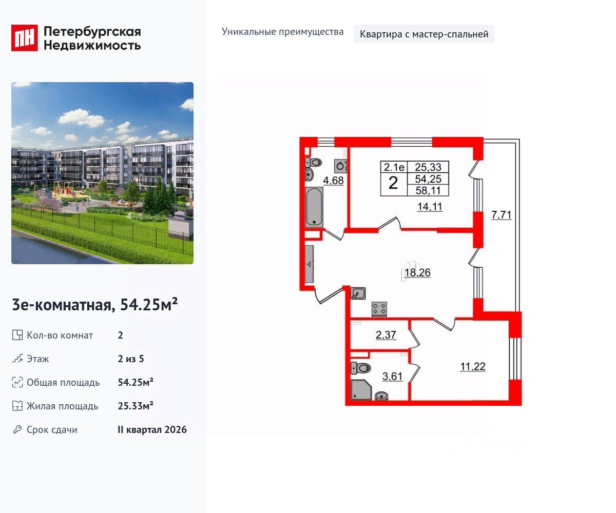 Уникальная, функциональная европланировка, большая кухня-гостиная 18.26 м². Общая площадь квартиры - 54.25 м², жилая 25.33 м², высота потолка 2.77 м.