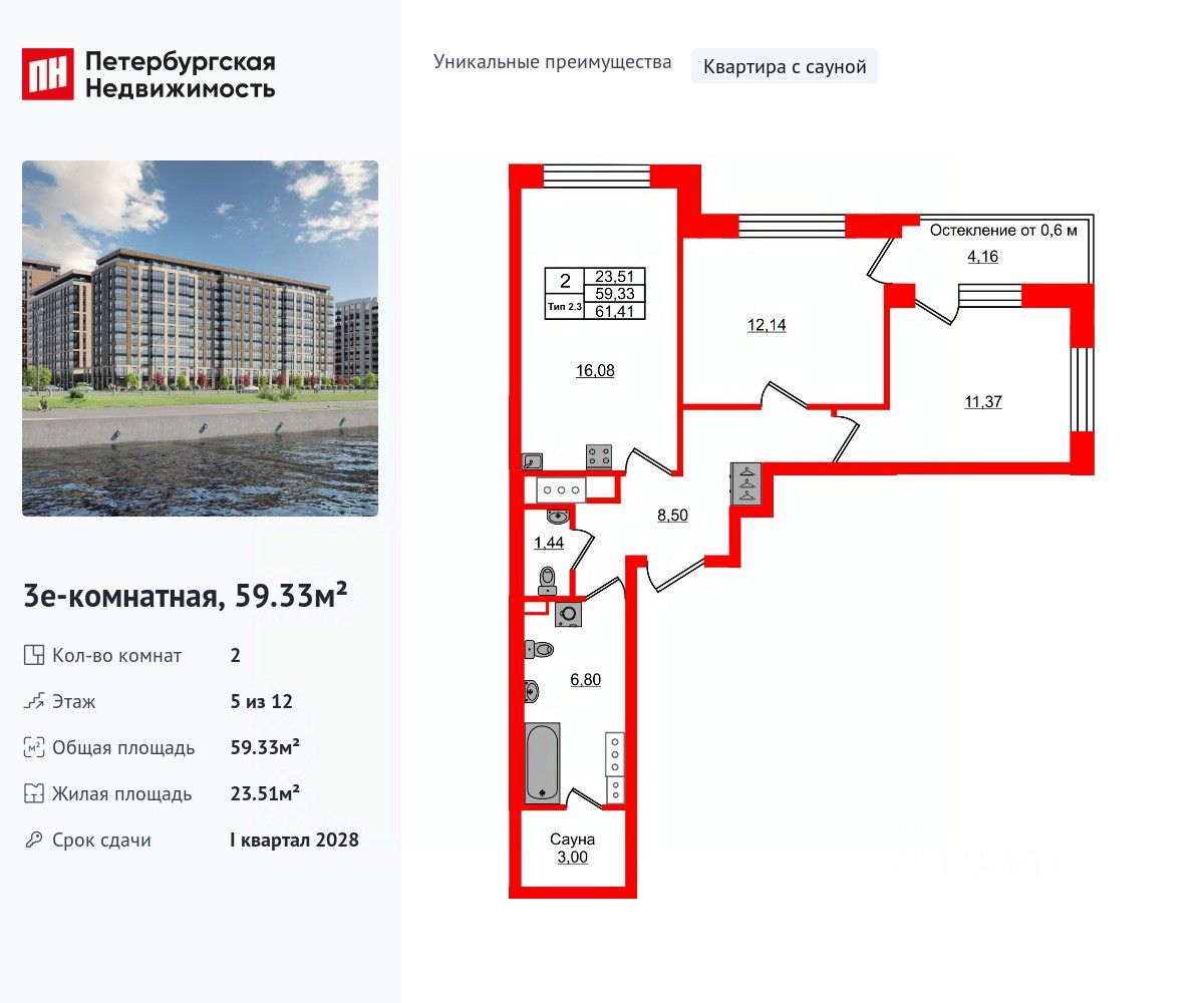 Уникальная, функциональная европланировка, большая кухня-гостиная 16.08 м², просторная прихожая 8.5 м². Общая площадь квартиры - 59.33 м², жилая 23.51 м², высота потолка 2.77 м.