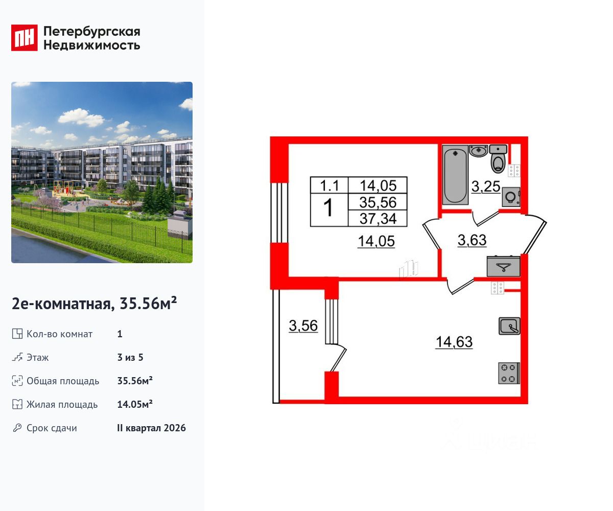 Удобная, классическая, функциональная европланировка, большая кухня-гостиная 14.63 м², вместительная прихожая 3.63 м². Общая площадь квартиры - 35.56 м², жилая 14.05 м², высота потолка 2.77 м.