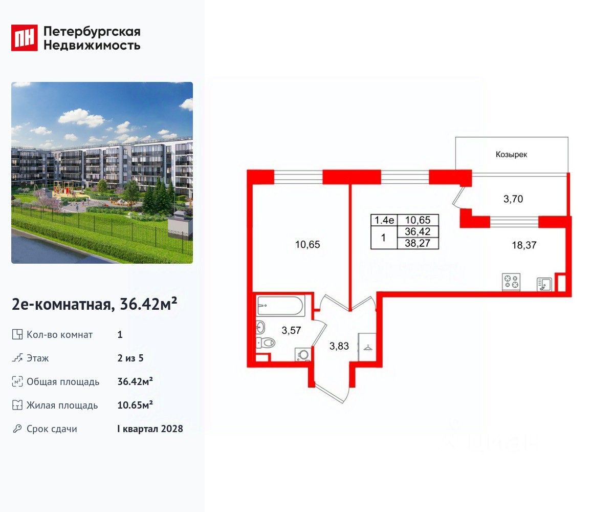 Удобная, классическая, функциональная европланировка, большая кухня-гостиная 18.37 м², вместительная прихожая 3.83 м². Общая площадь квартиры - 36.42 м², жилая 10.65 м², высота потолка 2.77 м.