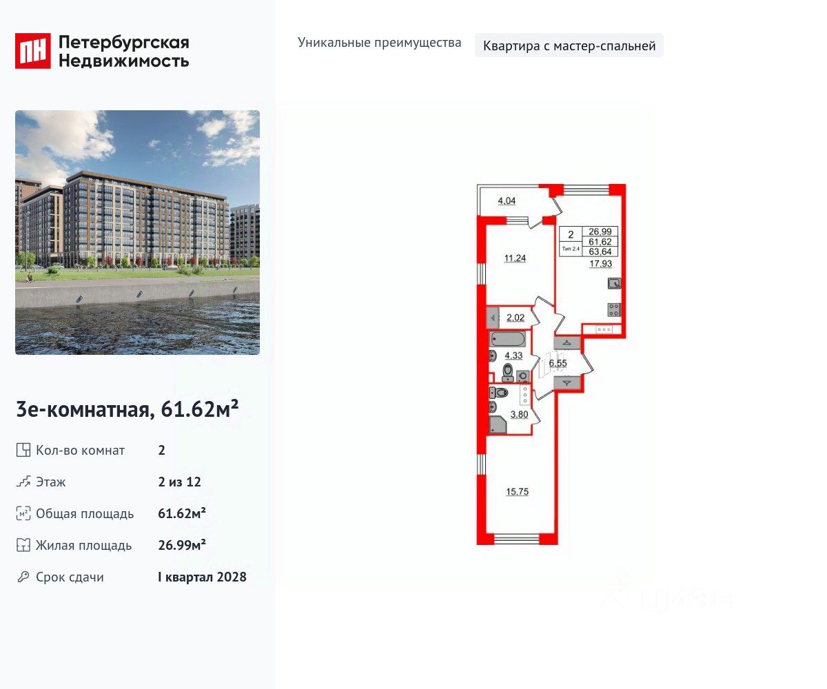 Уникальная, функциональная европланировка, большая кухня-гостиная 17.93 м², вместительная прихожая 6.55 м². Общая площадь квартиры - 61.62 м², жилая 26.99 м², высота потолка 2.77 м.