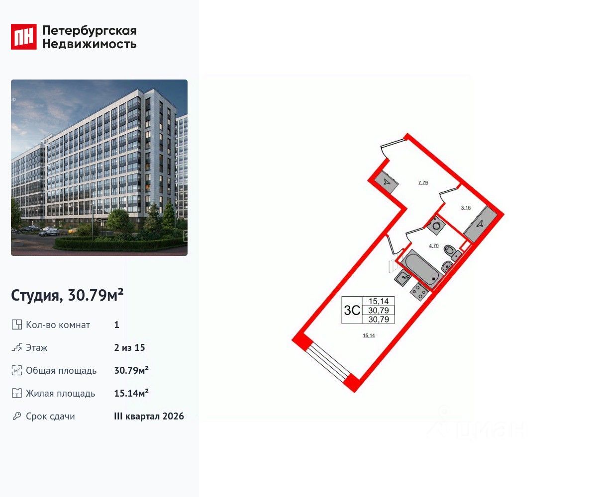 Удобная, классическая, функциональная европланировка, просторная прихожая 7.79 м². Общая площадь студии - 30.79 м², жилая 15.14 м², высота потолка 2.75 м.