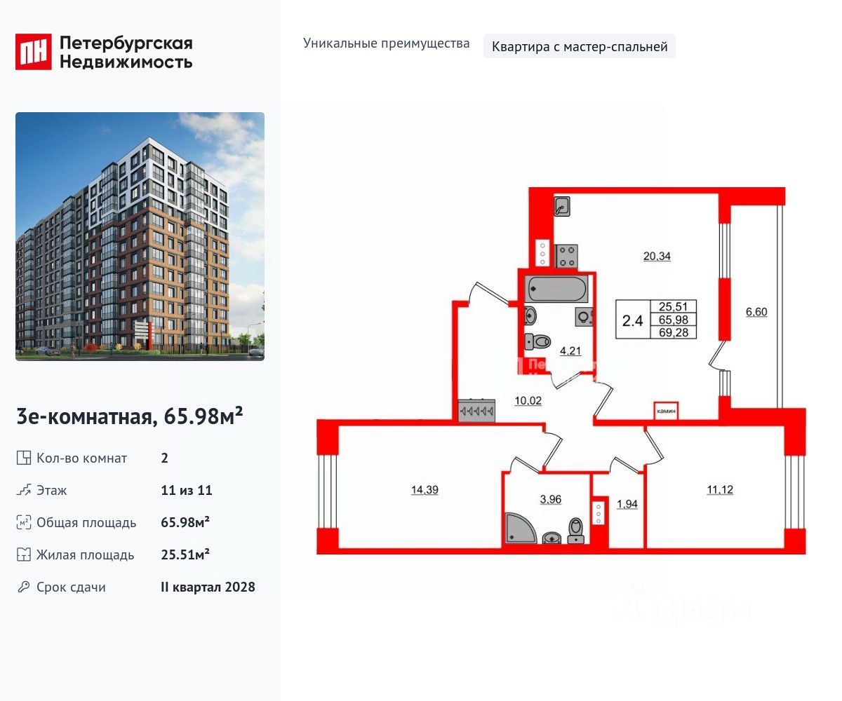 Уникальная, функциональная европланировка, большая кухня-гостиная 20.34 м², просторная прихожая 10.02 м². Общая площадь квартиры - 65.98 м², жилая 25.51 м², высота потолка 3 м.