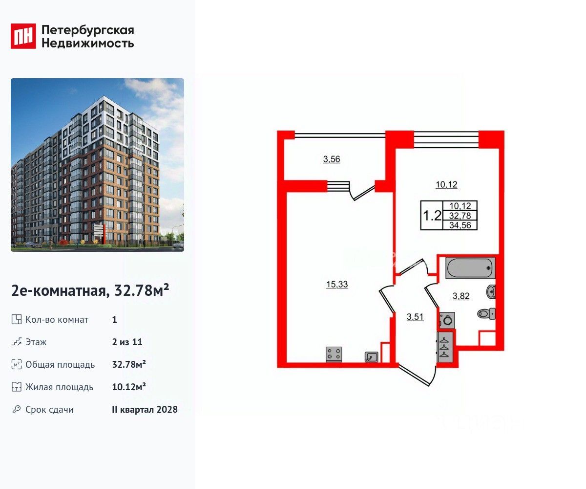 Удобная, классическая, функциональная европланировка, большая кухня-гостиная 15.33 м², вместительная прихожая 3.51 м². Общая площадь квартиры - 32.78 м², жилая 10.12 м², высота потолка 2.77 м.