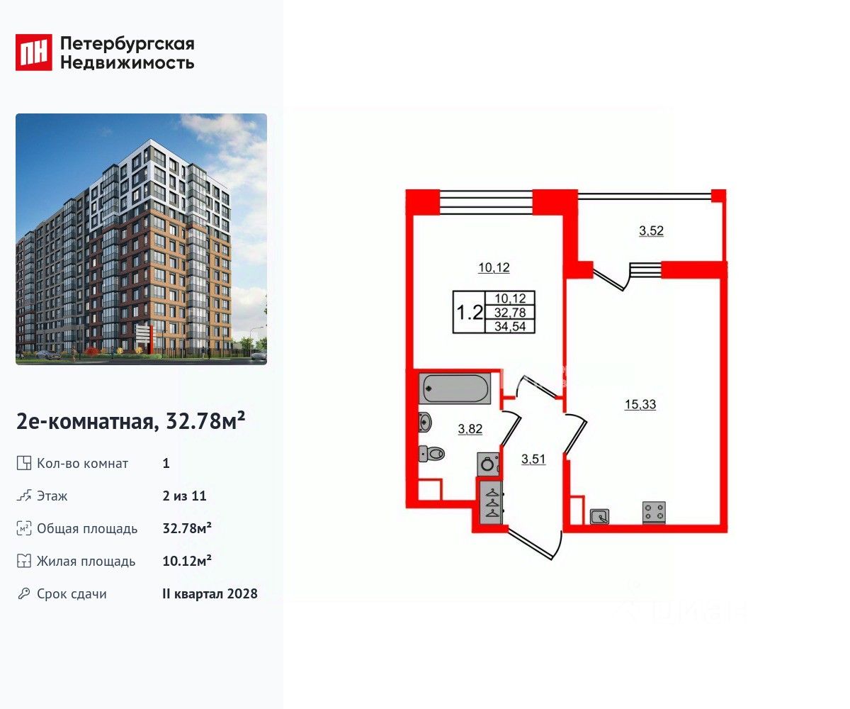 Удобная, классическая, функциональная европланировка, большая кухня-гостиная 15.33 м², вместительная прихожая 3.51 м². Общая площадь квартиры - 32.78 м², жилая 10.12 м², высота потолка 2.77 м.