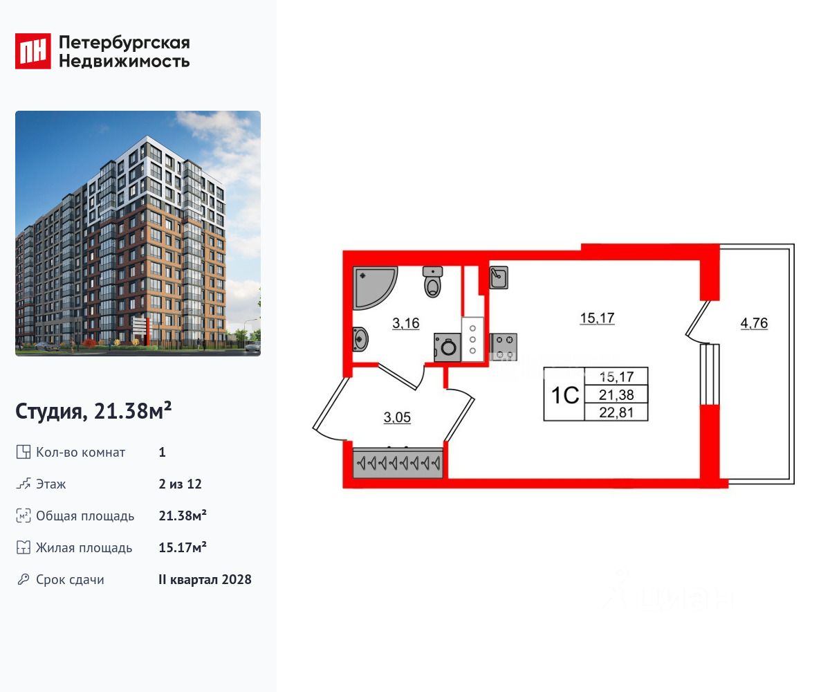 Удобная, классическая, функциональная европланировка, вместительная прихожая 3.05 м². Общая площадь студии - 21.38 м², жилая 15.17 м², высота потолка 2.77 м.
