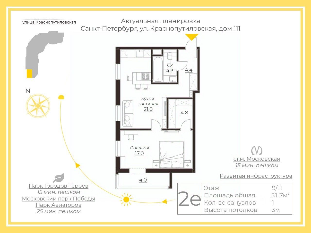 Удобная планировка: спальня 17 м2 с гардеробной и лоджией 4 м², кухня-гостиная 21 м2.