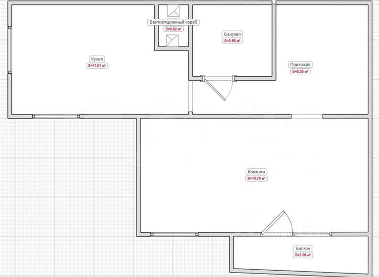 Просторная планировка: Большая кухня 12 м², прихожая 8 м² и отдельная комната 17 м², санузел 4 м². Есть остеклённый балкон.