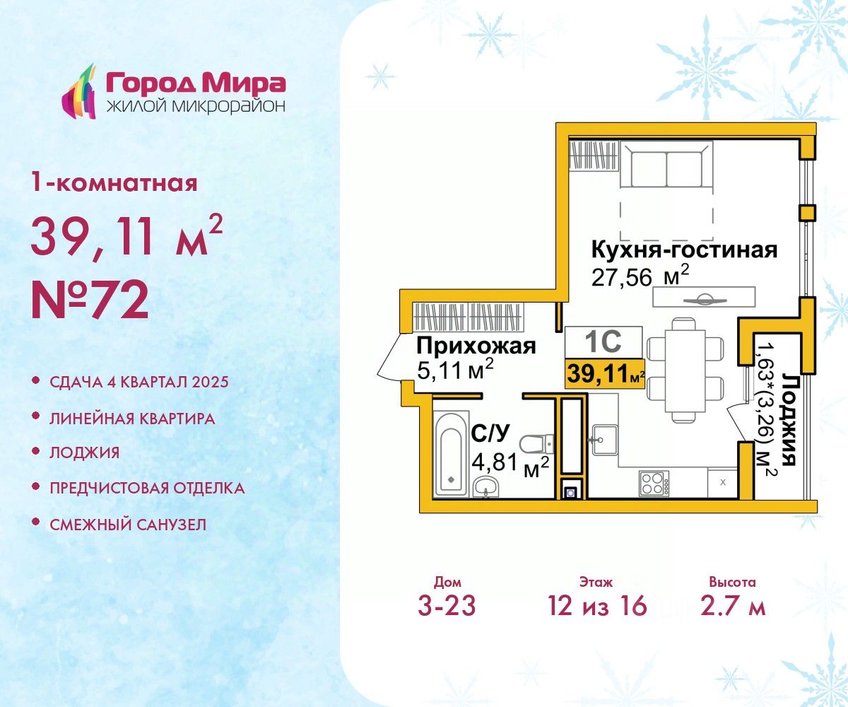 Продается 1-комн. квартира от застройщика с предчистовой отделкой в ЖМ ''Город Мира'' на 12 этаже. Общая площадь: 39.11 кв.м., жилая: 22.56 кв.м., площадь кухни: 5 кв.м. Все окна выходят на одну сторону. В квартире одна лоджия, один совмещенный санузел. Высота потолков 2.7 м.