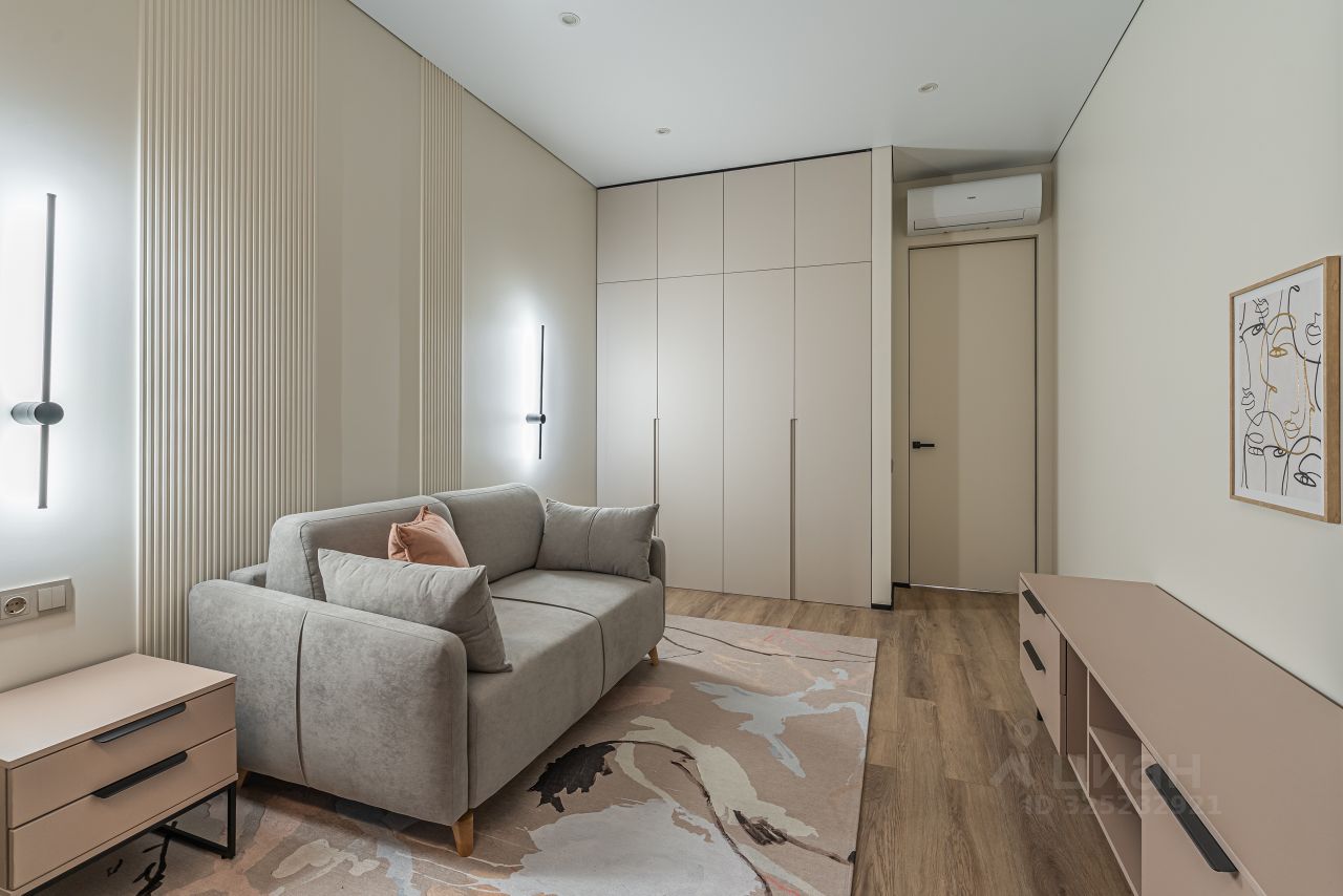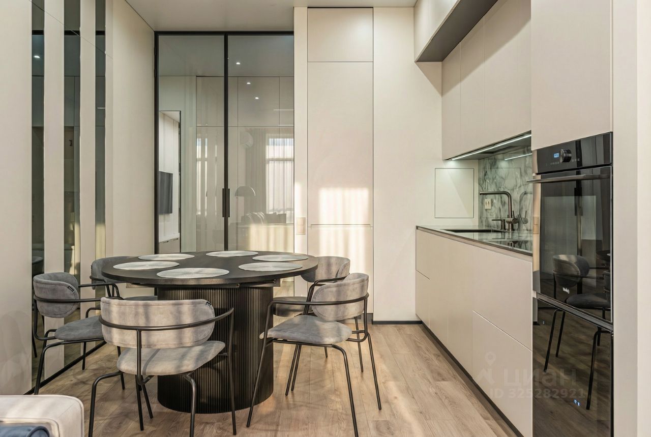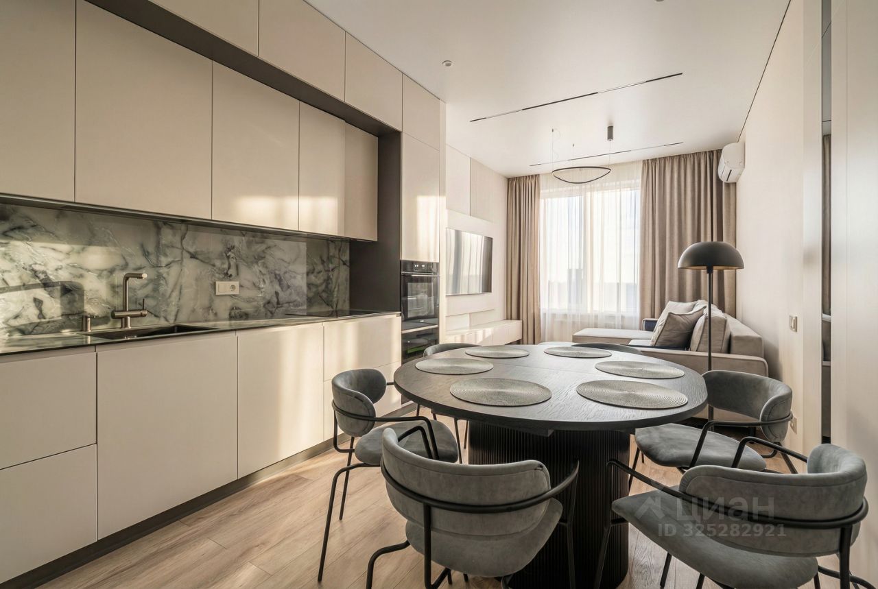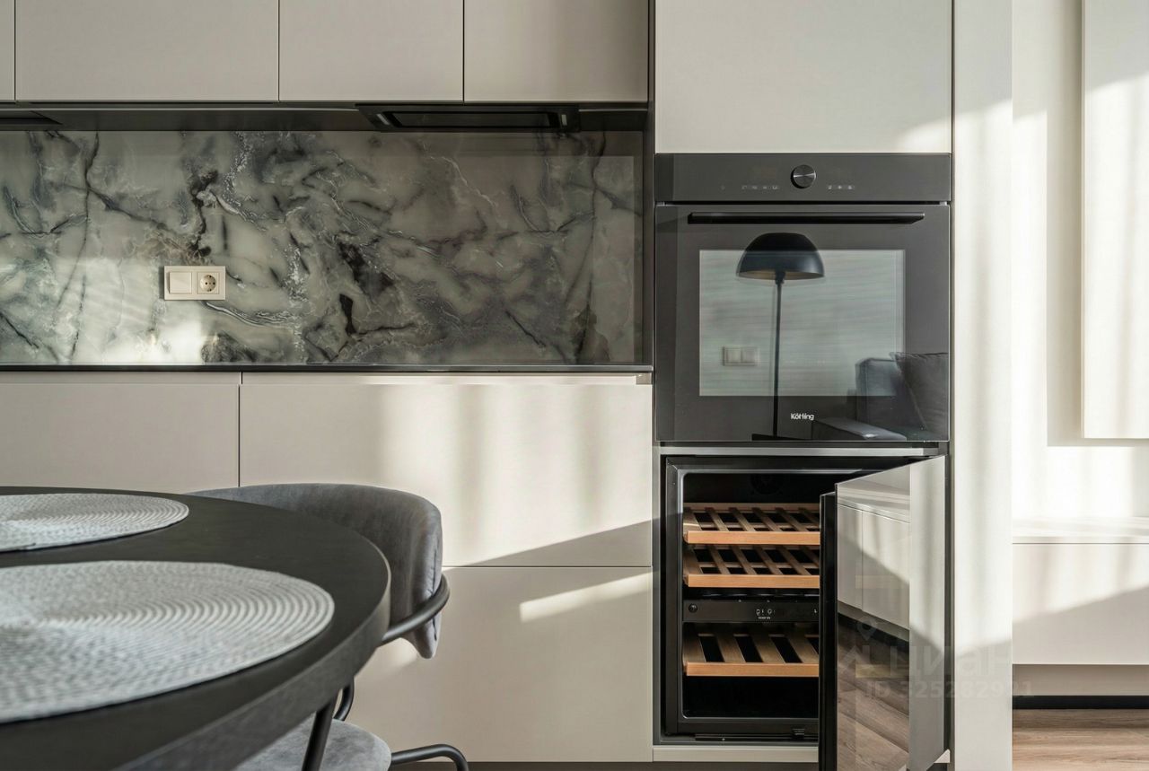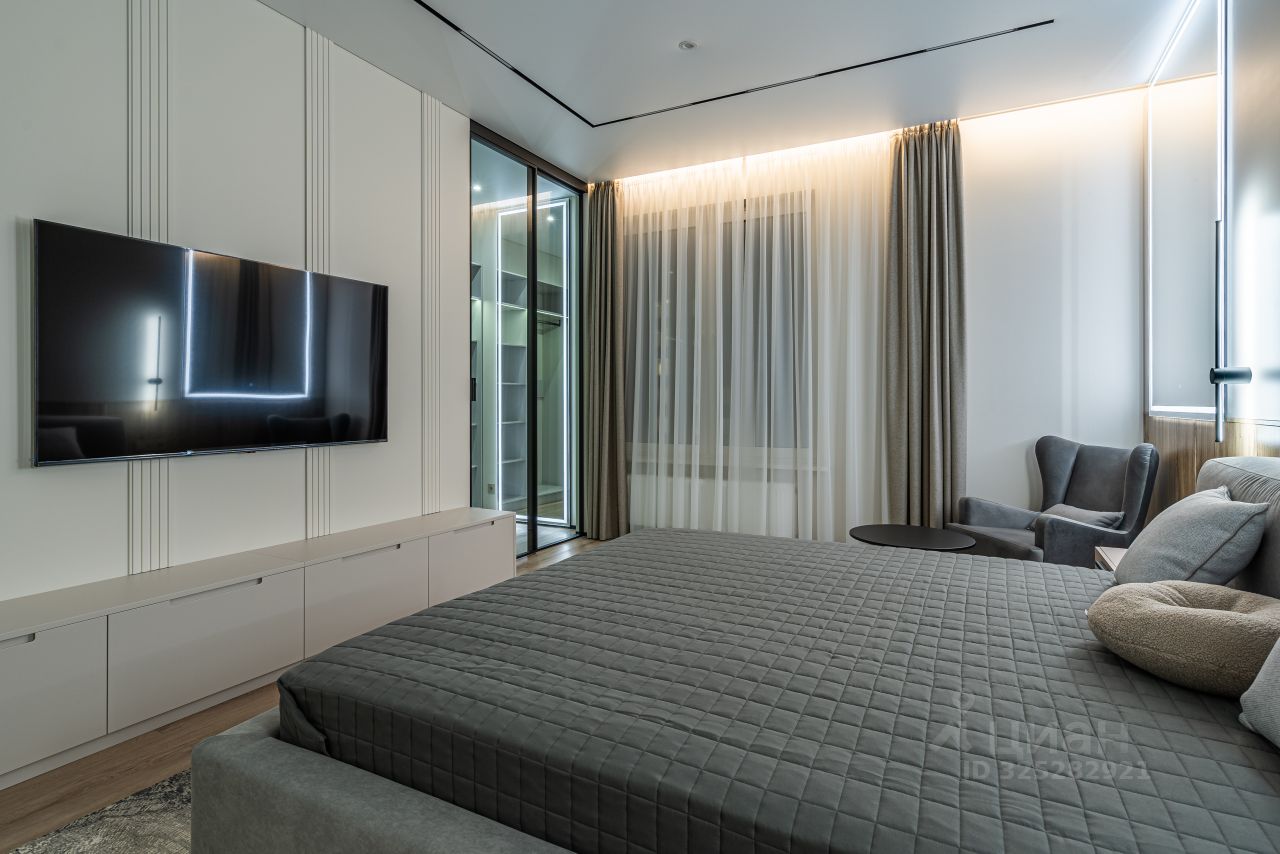 В кухне установлен кухонный гарнитур фирмы Kapittel, выполненный под заказ из Австрийских материалов, суперпрочные фасады, покрытые 7-слойной эмалью, механизмы Blum, столешница фирмы Ligron из высокотехнологичного композитного материала Compact Solid, мойка и смеситель с фильтром для питьевой воды фирмы Omoikiri (Япония), вся встроенная техника фирмы KОRTING (Германия)-встроенный холодильник, посудомоечная машина, духовой шкаф, варочная поверхность, вытяжка, винный шкаф. Диван, стол, стулья, телевизор LG, подвесная ТВ полка. В спальне: спальный гарнитур, телевизор LG. В гардеробе-встроенная гардеробная система, зеркало с подсветкой, стиральная и сушильная машины фирмы KОRTING. В коридоре: вместительный шкаф для вещей, зеркало с подсветкой, пуф.
