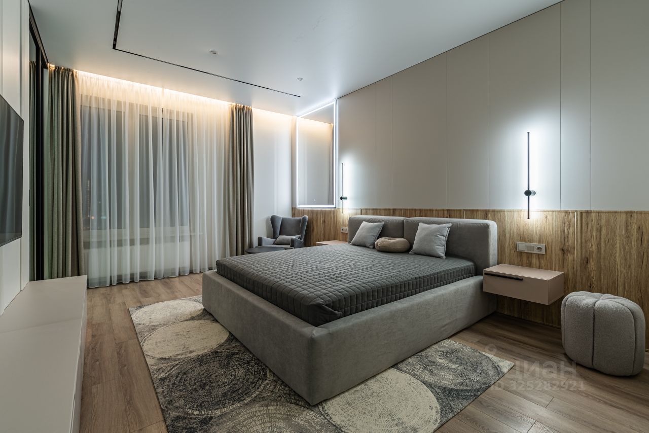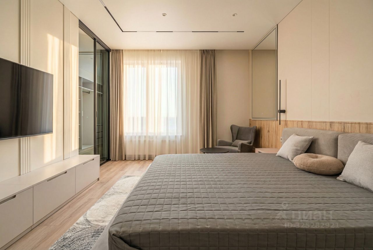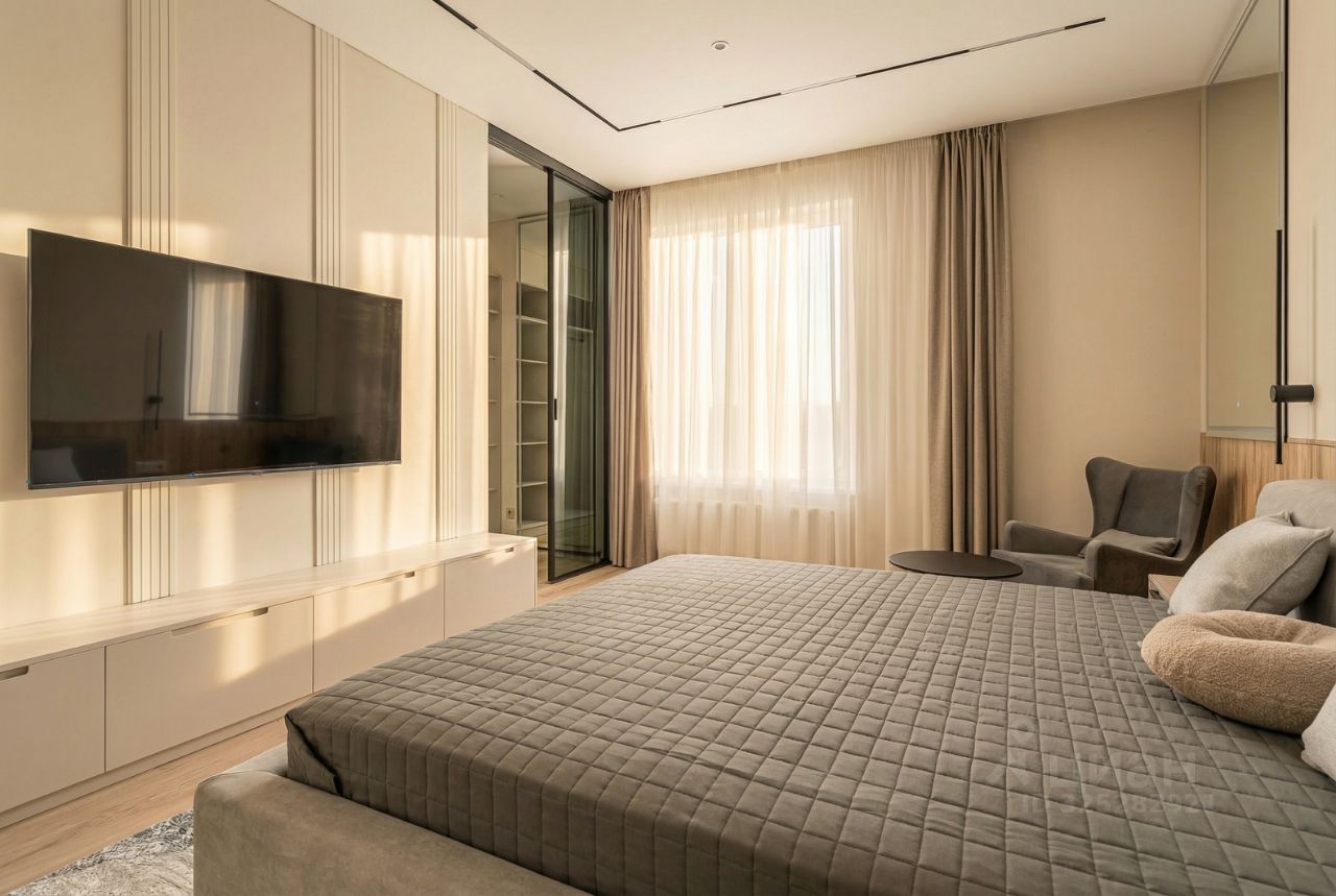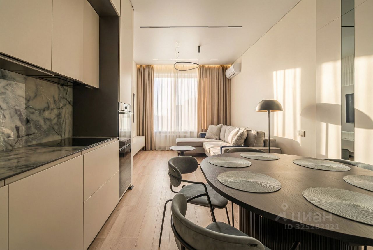 В кухне установлен кухонный гарнитур фирмы Kapittel, выполненный под заказ из Австрийских материалов, суперпрочные фасады, покрытые 7-слойной эмалью, механизмы Blum, столешница фирмы Ligron из высокотехнологичного композитного материала Compact Solid, мойка и смеситель с фильтром для питьевой воды фирмы Omoikiri (Япония), вся встроенная техника фирмы KОRTING (Германия)-встроенный холодильник, посудомоечная машина, духовой шкаф, варочная поверхность, вытяжка, винный шкаф. Диван, стол, стулья, телевизор LG, подвесная ТВ полка. В спальне: спальный гарнитур, телевизор LG. В гардеробе-встроенная гардеробная система, зеркало с подсветкой, стиральная и сушильная машины фирмы KОRTING. В коридоре: вместительный шкаф для вещей, зеркало с подсветкой, пуф.