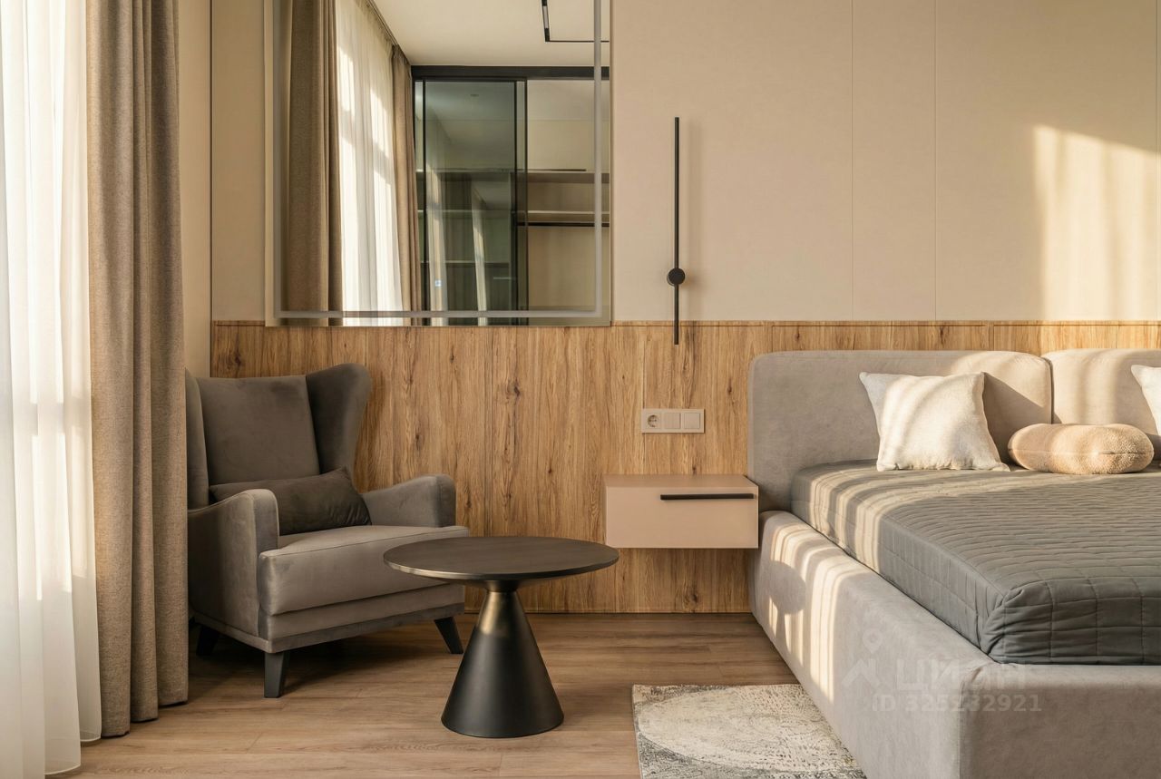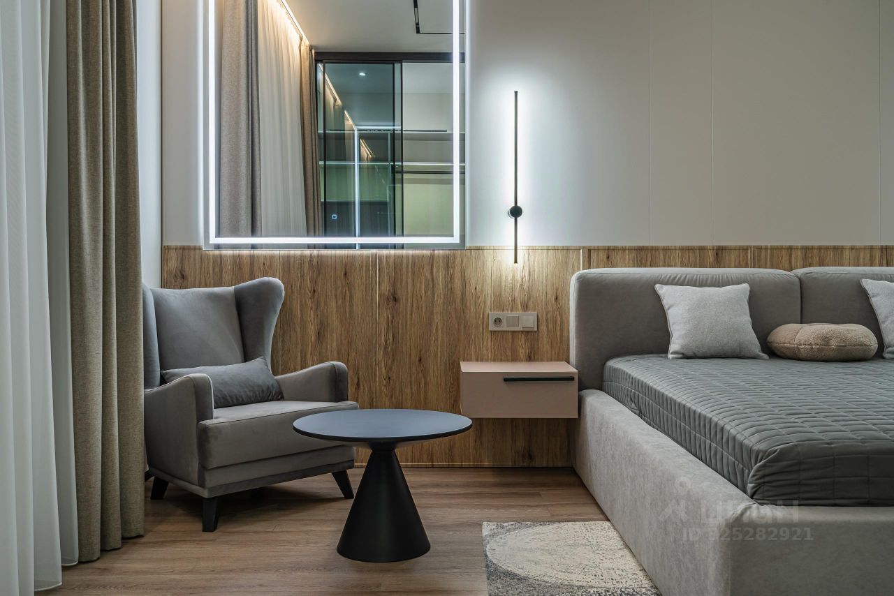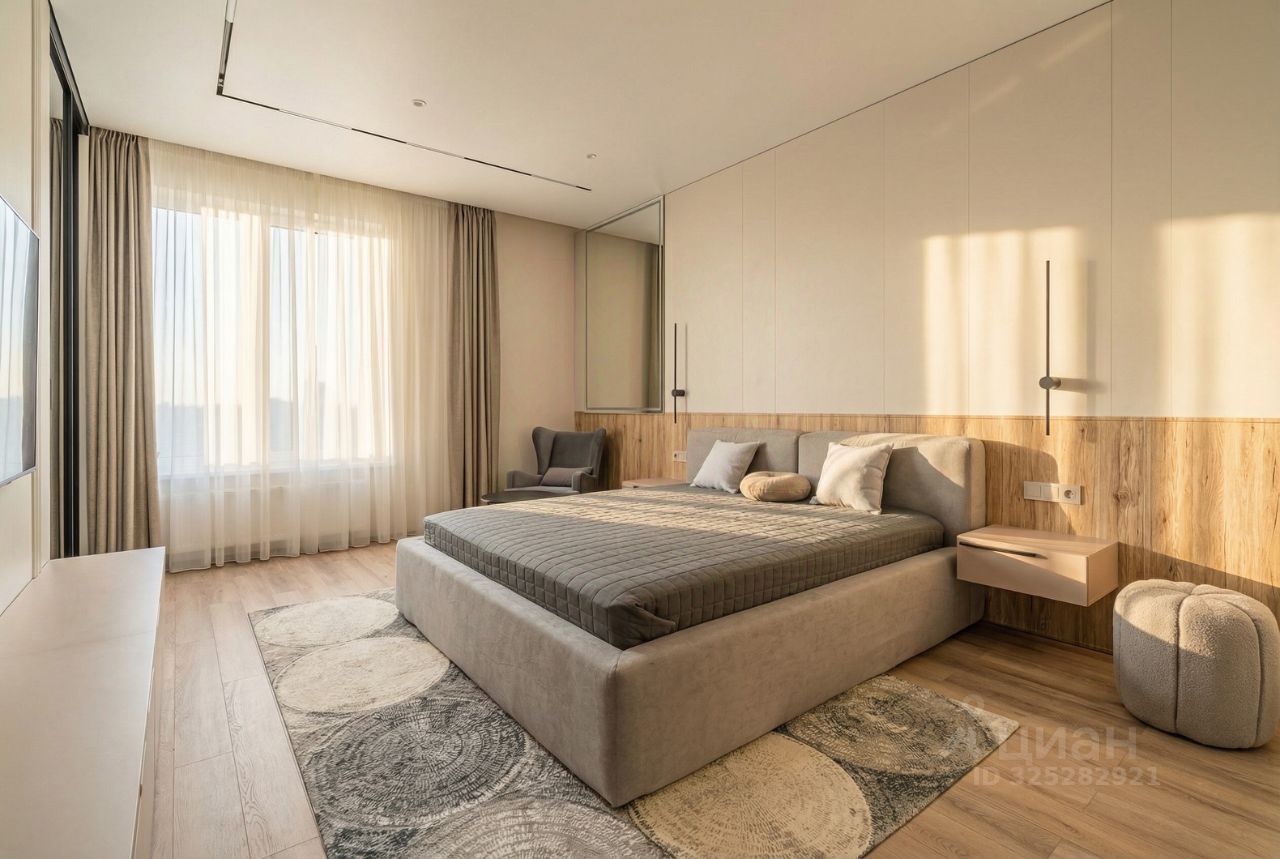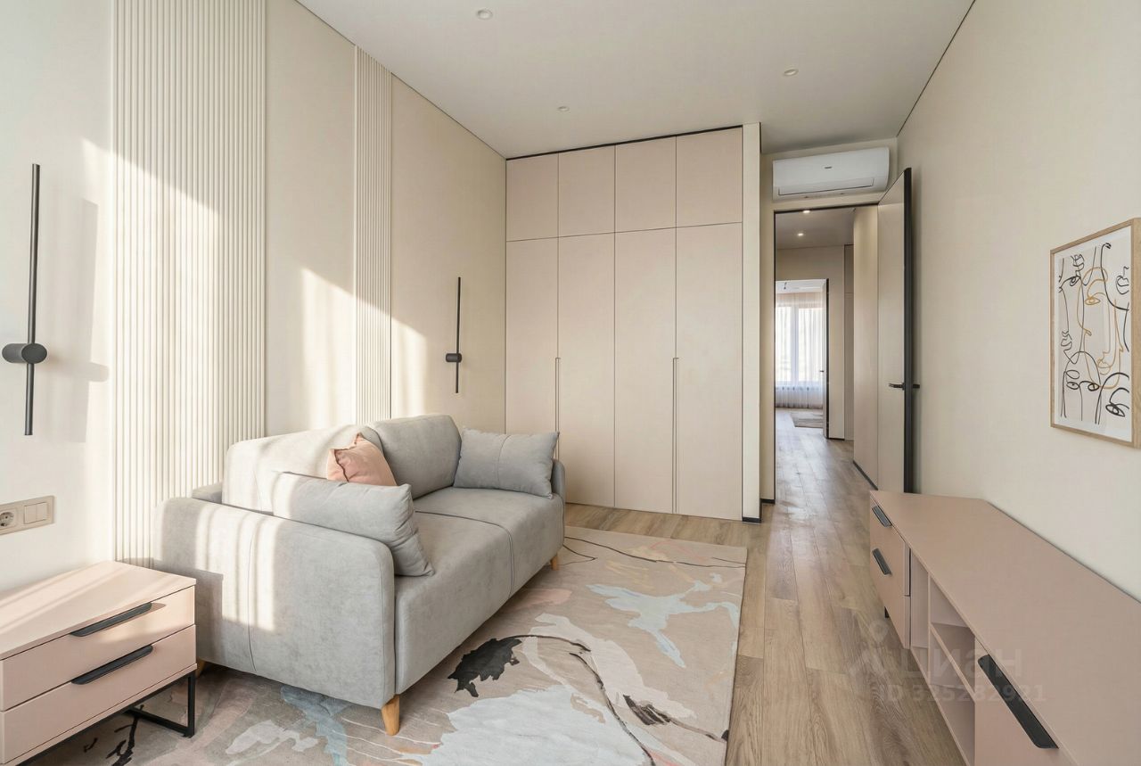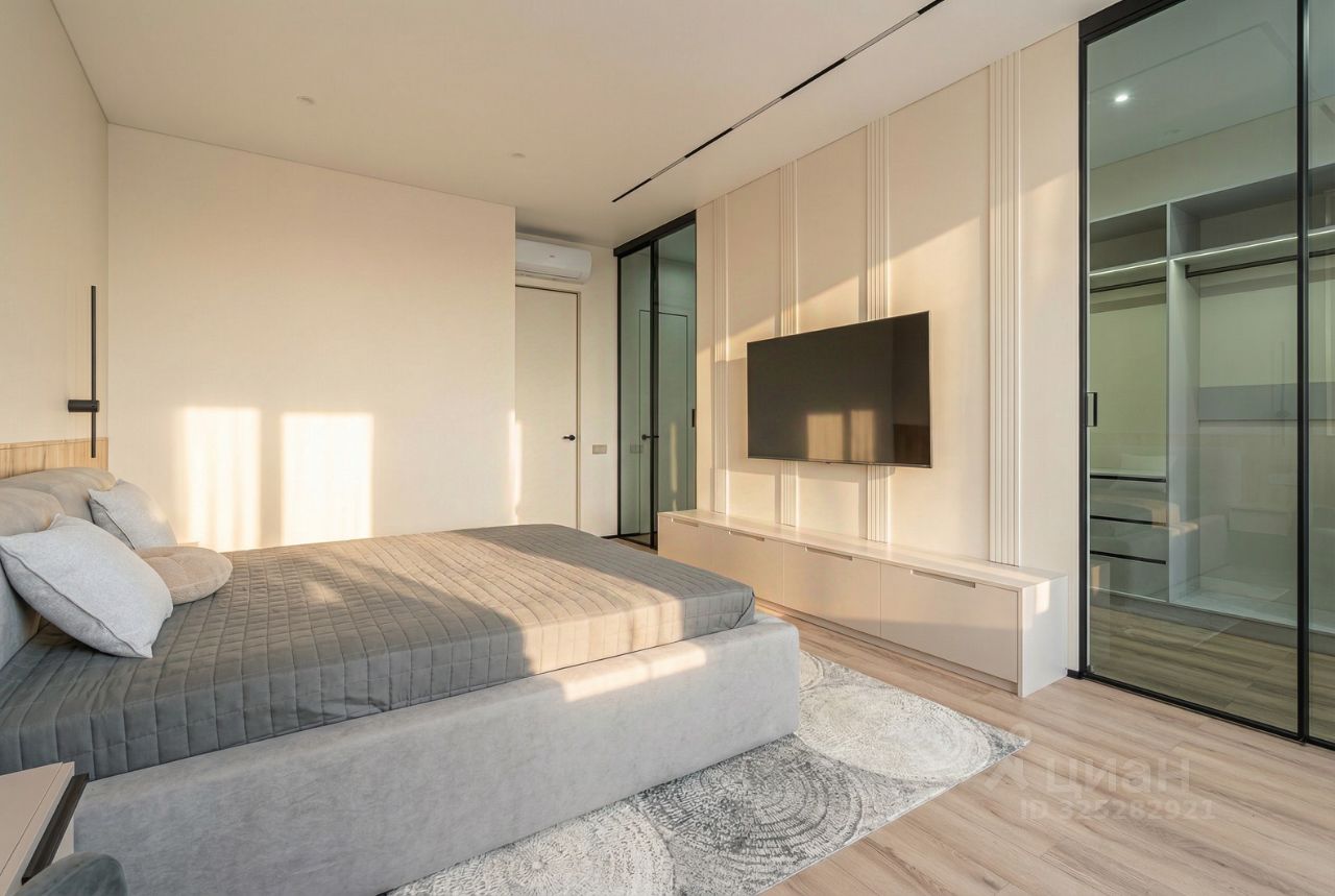 В кухне установлен кухонный гарнитур фирмы Kapittel, выполненный под заказ из Австрийских материалов, суперпрочные фасады, покрытые 7-слойной эмалью, механизмы Blum, столешница фирмы Ligron из высокотехнологичного композитного материала Compact Solid, мойка и смеситель с фильтром для питьевой воды фирмы Omoikiri (Япония), вся встроенная техника фирмы KОRTING (Германия)-встроенный холодильник, посудомоечная машина, духовой шкаф, варочная поверхность, вытяжка, винный шкаф. Диван, стол, стулья, телевизор LG, подвесная ТВ полка. В спальне: спальный гарнитур, телевизор LG. В гардеробе-встроенная гардеробная система, зеркало с подсветкой, стиральная и сушильная машины фирмы KОRTING. В коридоре: вместительный шкаф для вещей, зеркало с подсветкой, пуф.