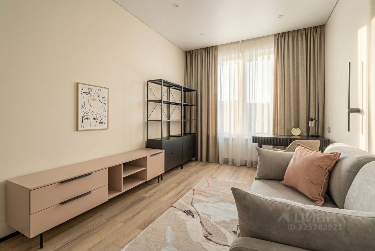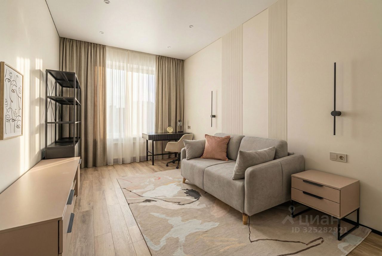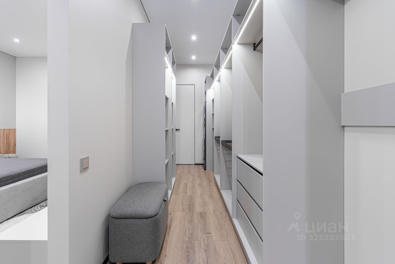 Площадь квартиры 90 м2, расположена на 10-м этаже, планировка 3х-евро: кухня-гостиная 23м2 с зоной для отдыха, мастер спальня 20.7 с гардеробной 10 м2 и санузлом и 2.4 м2, кабинет- гостевая 16.6 м2, ванная 3.8 м2, просторная прихожая 10 м2, высота потолков 3.0 метра.