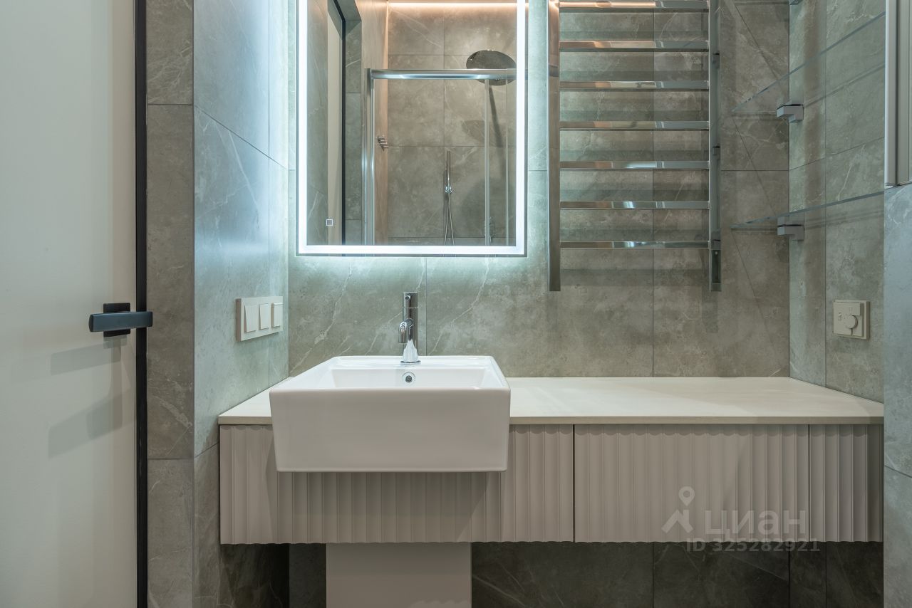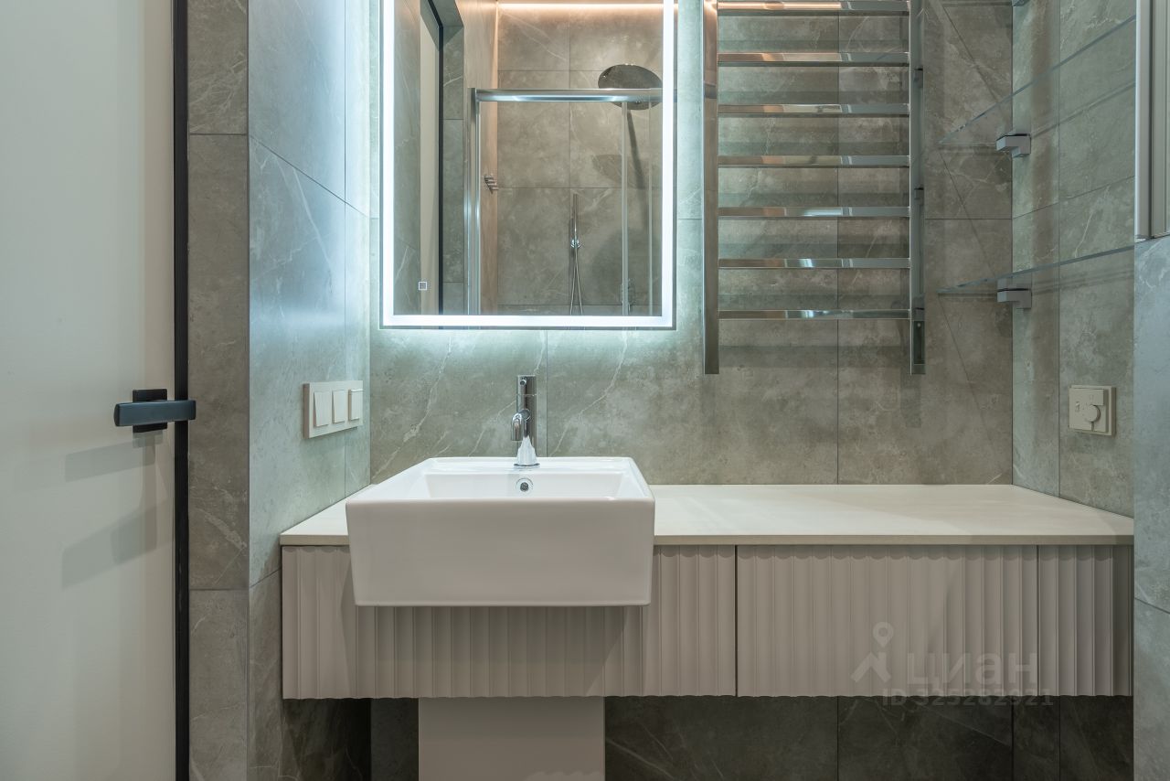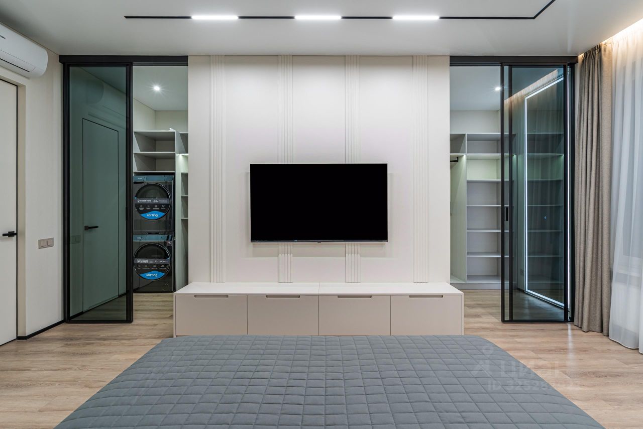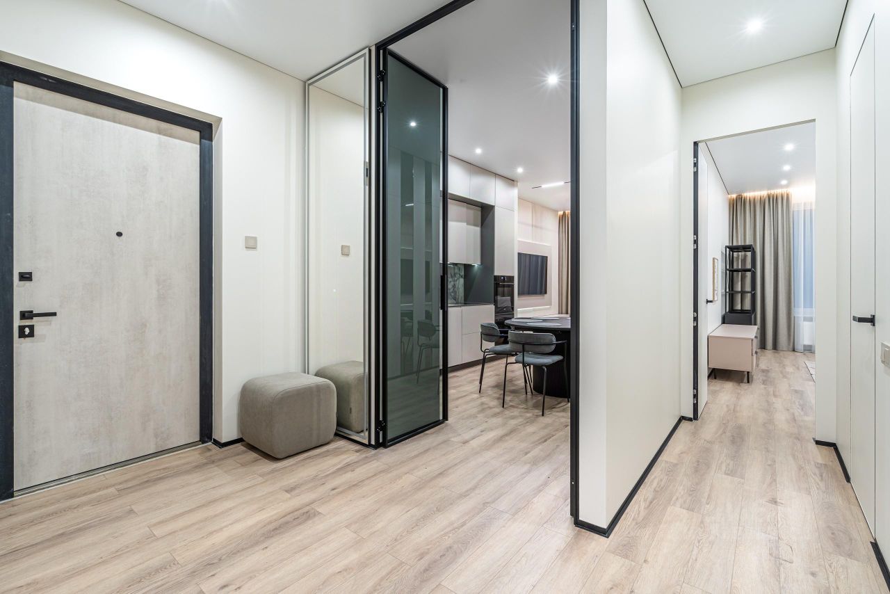В квартире выполнен дизайнерский ремонт по индивидуальному проекту: теневые потолки с современными трековыми светильниками, на полу установлено каменно-полимерное покрытие, в ванных комнатах- керамогранит, стены выкрашены износостойкой краской с алмазной прочностью DULUX DIAMOND, установлены современные межкомнатные двери скрытого монтажа по индивидуальному заказу, стены декорированы панелями и декоративными зеркальными вставками, установлены распашные стеклянные двери в кухню-гостиную, в гардеробной установлены раздвижные стеклянные двери, выполненные под заказ. Протянут интернет кабель. Установлена система от протечек. Установлена сплит система фирмы Xaier. В Ванных комнатах: акриловая ванна Lavinia Boho One, душевые комплекты с тропическим душем Bohem Uno, гигиенический душ, смесители-производство Италия, стеклянная душевая шторка Vincea VSP (Италия), зеркала с подсветкой, подвесные тумбы с раковиной, инсталляции с подвесными унитазами.