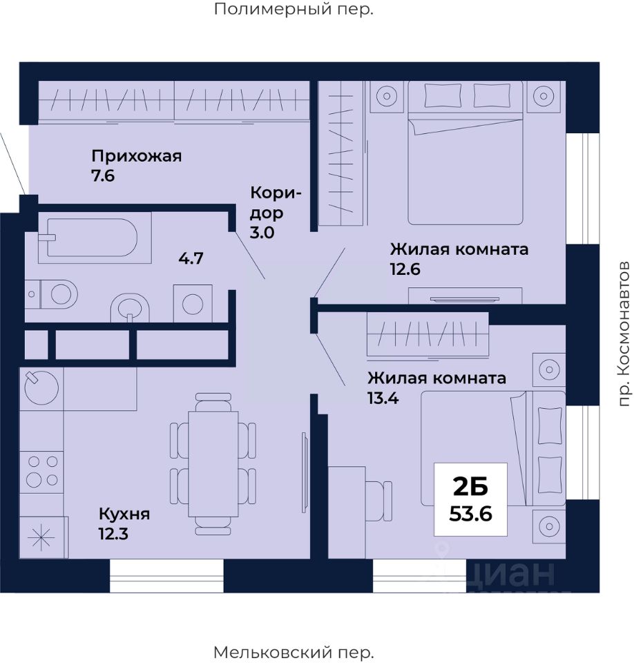 Продаётся 2-комнатная квартира в строящемся доме (Дом 8,9), срок сдачи: I-кв. 2029, общей площадью 53.6 кв.м., на 18 этаже. ЖК ''Космос'' - современный жилой квартал на проспекте Космонавтов 7, который строит ГК ''Ривьера Инвест Екатеринбург''. Жилой комплекс - это пять домов, благоустроенная территория комплекса и наземная парковка. Места общего пользования также выполнены в единой стилистике ''космической'' темы, используемой и в оформлении холлов, и дворов.