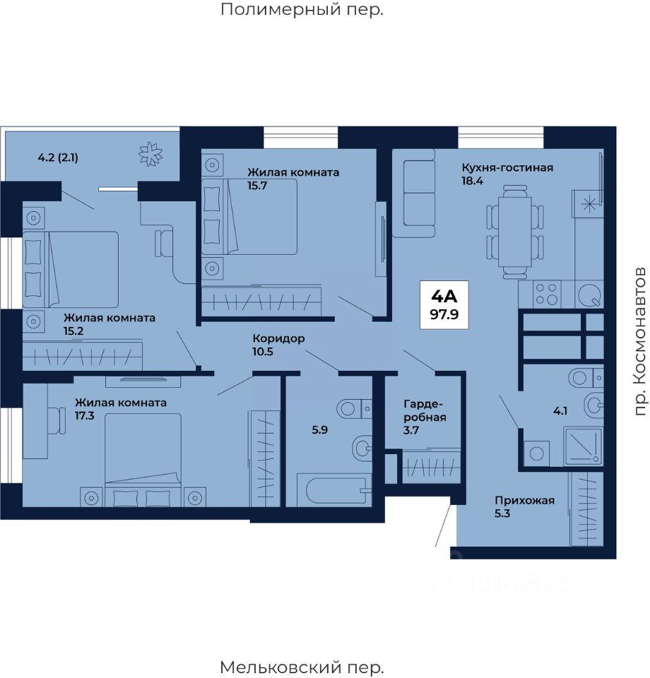 Продаётся 3-комнатная квартира в строящемся доме (Дом 8,9), срок сдачи: I-кв. 2029, общей площадью 97.9 кв.м., на 30 этаже. ЖК ''Космос'' - современный жилой квартал на проспекте Космонавтов 7, который строит ГК ''Ривьера Инвест Екатеринбург''. Жилой комплекс - это пять домов, благоустроенная территория комплекса и наземная парковка. Места общего пользования также выполнены в единой стилистике ''космической'' темы, используемой и в оформлении холлов, и дворов.