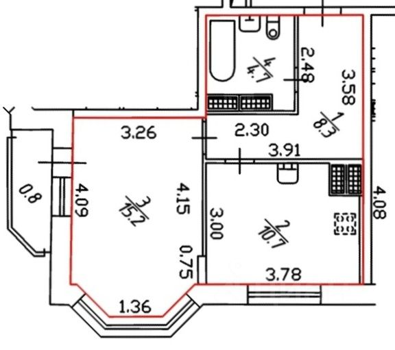 Soбщ.=38,9м² (без учёта S балкoнa=2,7м²). Комната с окнами на две стороны: 15,2м². S кухни=10,7м². Сан.узел совмещенный.
