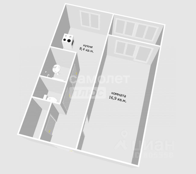 Площадь комнаты 16,9 кв.м., площадь кухни 8,4 кв.м.
