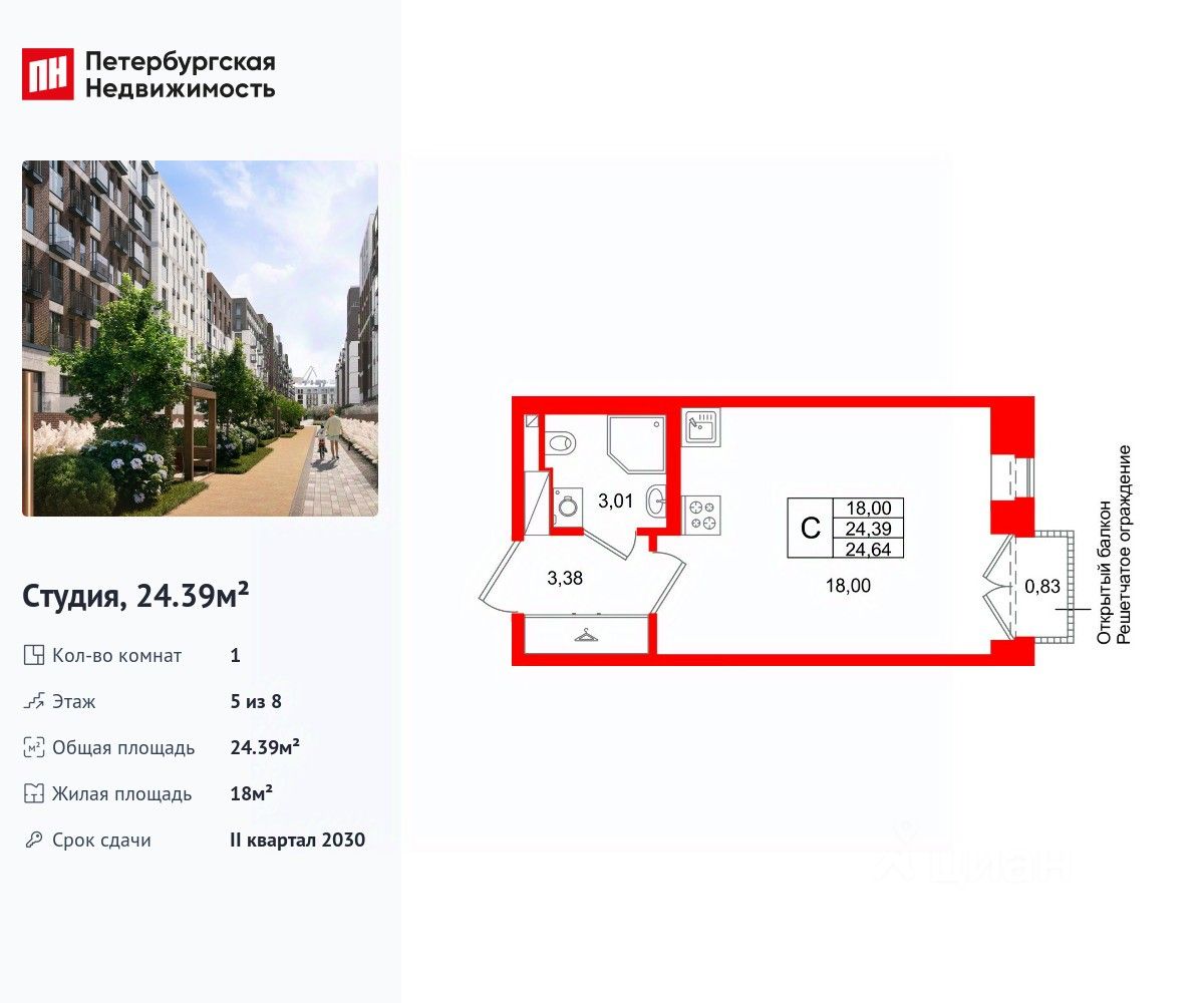 Удобная, классическая, функциональная европланировка, просторная прихожая 3.38 м². Общая площадь студии - 24.39 м², жилая 18 м², высота потолка 2.7 м.