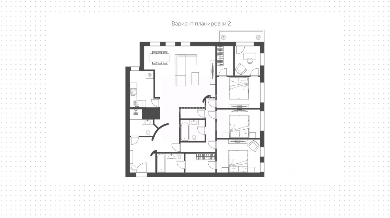 Возможная планировка: • просторная кухня-гостиная с выходом на лоджию • две спальни с собственными гардеробными и санузлами • кабинет или спальня • гостевой санузел • гардеробная в прихожей