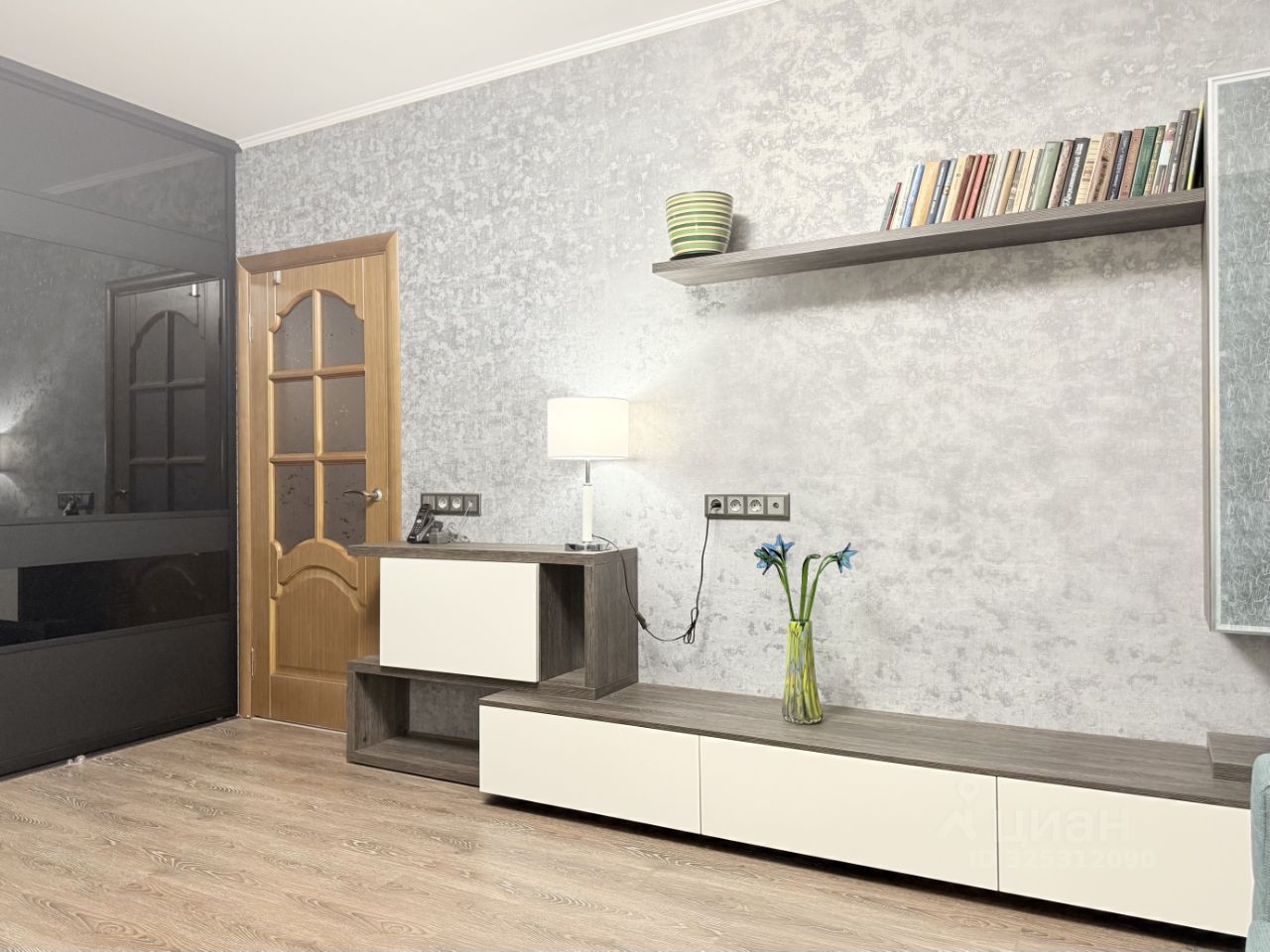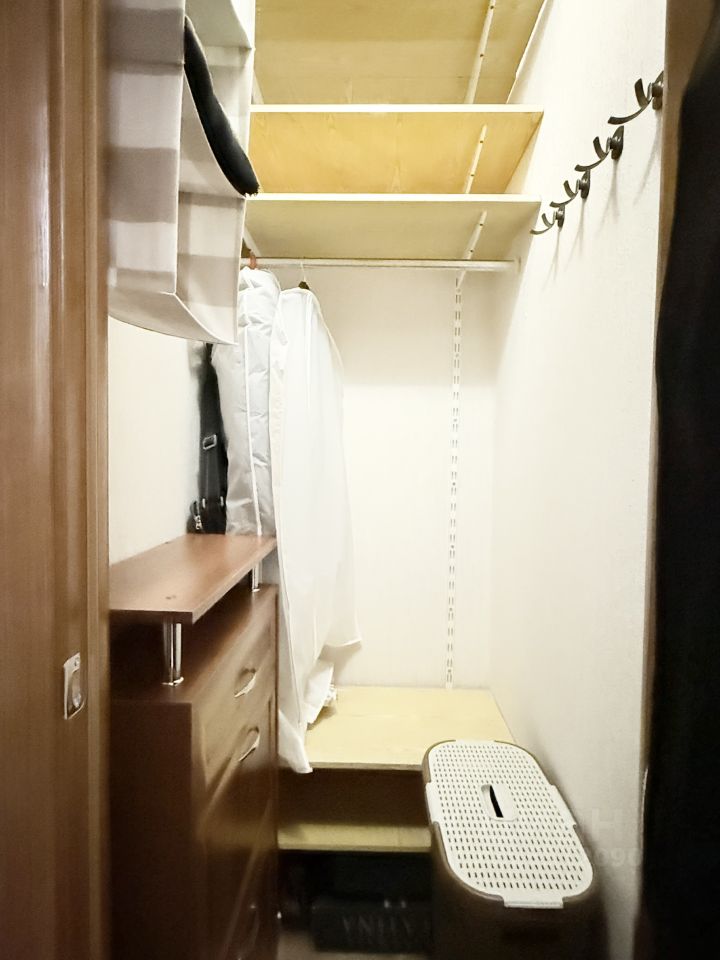 В комнате вместительный встроенный шкаф-купе до потолка, удобные раскладывающиеся диваны и изящная система навесных полок для хранения. Выведены розетки под телевизор.